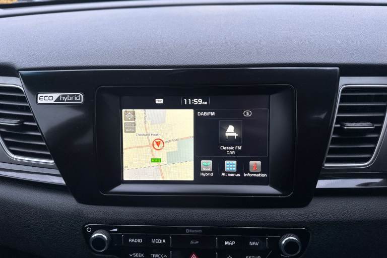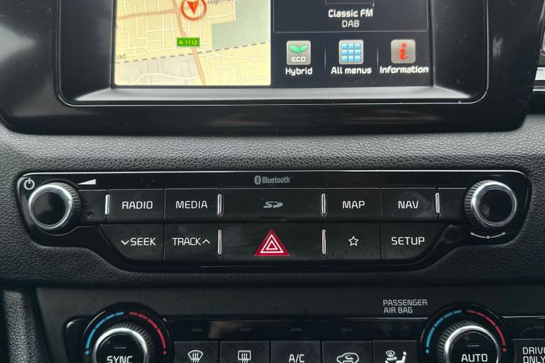 ..7'' touch screen sat nav with TMC, Apple car play/Android Auto, Bluetooth audio streaming with voice recognition, Colour information display, Digital clock, Drive mode selector, Emergency stop signalling system, Kia connected services, Lane keep assist, Power Steering, Rear parking sensors, Reversing camera, Roll over sensor, Speed limiter, Trip computer, 'Shark fin' mobile antenna, 4.2-Inch Colour TFT Screen, 6 speakers, DAB Radio with MP3, Steering wheel mounted controls, USB connection located in centre console, USB/aux input socket, Auto dimming rear view mirror, Automatic defog system, Automatic headlight control system, Black side sills, Body colour bumpers, Chrome beltline trim, Chrome door handles, Chrome grille surround, Driver's side wide angle mirror, Electric adjustable/heated/folding door mirrors, Electric windows + anti trap protection + one touch open/close drivers side, Follow me home headlights, Front fog lights, High gloss black door mirrors, LED daytime running lights, LED indicators in door mirrors, LED tail lights, Manual headlight levelling, Matt black radiator grille, Privacy glass (rear side windows and rear screen), Projector headlamps, Rain sensing front wipers, Rear spoiler, Rear wiper, Roof rails, Solar glass, Wheel arch mouldings, 12V power in rear centre console, 60/40 split/folding 2nd row of seats, Ambient lighting, Assist grips, Centre console storage box, Door armrest in leather, Driver's seat height adjuster, Driver/passenger sunvisors with illuminated vanity mirrors, Dual zone automatic air conditioning, Front and rear door pockets, Front map light with sunglasses case, Front/rear centre armrests, Headlining in Light grey, Height adjustable headrests, High gloss black steering wheel trim, Illuminated ignition key hole, Isofix child seat attachment, Leather trimmed gearshift, Leather trimmed steering wheel, Luggage area lamp, Luggage compartment cover, Luggage net with hooks, Part leather upholstery, Passenger seat back pocket, Rear armrests with cupholder, Satin chrome interior door handles, Tilt/telescopic adjustable steering wheel, Ventiliation ducts to rear compartment, 3 point seatbelts on all seats, ABS, Active front headrests, Automatic unlocking of doors in case of impact, Autonomous emergency braking, Curtain airbags, Drivers knee airbag, Electronic stability control, Foot operated parking brake, Height adjustable front seatbelts, Hill start assist control (HAC), Passenger airbag deactivate switch, Traction