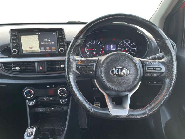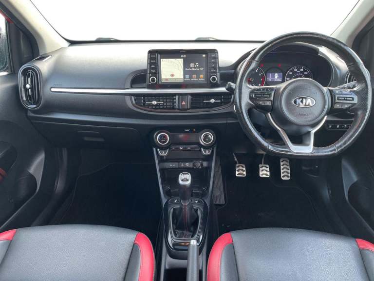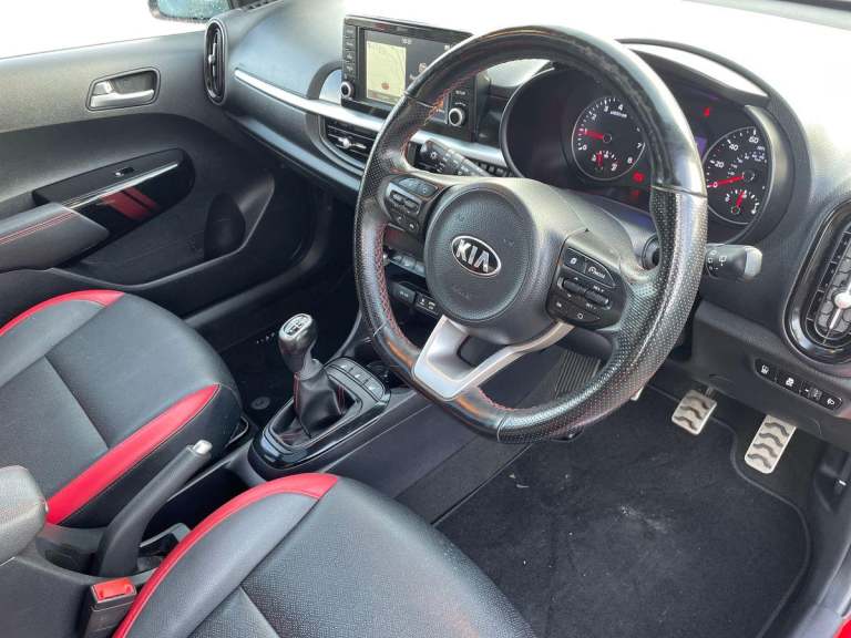 ..7'' Touch screen satellite naviagtion with RDS and DAB, Apple car play/Android Auto with voice control, Cruise control + speed limiter, Digital clock, Emergency stop signalling system, External temperature gauge, Kia connected services, Motor driven power steering, Rear parking sensors, Reversing camera system with dynamic guidelines (Integrated into centre fascia screen), Tachometer, Trip computer, Wireless Smartphone charger, 6 speaker audio system, Bluetooth with music streaming, Steering wheel mounted controls, USB and auxiliary socket, Automatic headlights, Bi-function projection headlights, Black radiator grille with chrome surround, Body colour bumpers, Body colour side sill mouldings, Body coloured mirrors and chrome exterior handles, Chrome side window trim, Day/night rear view mirror, Electric adjustable/heated/folding door mirrors with LED indicators lights, Electric sunroof, Front and rear electric windows with drivers's auto up/down function, Front fog lights, Headlamp levelling, Heated rear window, High mount brake light, LED daytime running lights, LED rear lights, Privacy glass - Rear windows and tailgate, Rear fog lights, Rear wash/wipe, Sports front and rear bumpers with twin exhaust, Tinted glass, Variable front intermittent wipers, Visible VIN plate, Welcome and follow-me home light functionality, 12V power point front, 3 x passenger assist grips, 60/40 split/folding 2nd row of seats, All round height adjustable headrests, Aluminium pedals, Automatic air conditioning, Black and red accents front door armrest, Centre Console with Storage Box and Sliding Armrest, Coat hooks, Cupholders in centre console, Driver and front passenger sunvisors with driver's side illuminated vanity mirrors, Driver seat height adjust, Dual Height Luggage Area Floor, Faux leather upholstery, Front cabin lights, Glovebox, Heated front seats, Heated steering wheel, High gloss lower centre fascia trim, door armrest and air vents, ISOFIX Child seat top tethers and anchor fixings, Leather trimmed steering wheel and gearshift, Luggage area light, Luggage area parcel shelf, Luggage net with hooks, Passenger front seatback pockets, Satin chrome interior door handles, Slide/reclining front seats, Tilt adjustable steering wheel, Advanced Driver Assistance Pack - Picanto, 3x3 point rear seatbelts, ABS/EBD, Automatic unlocking of doors in case of impact, Dual front airbags, ESC + BAS + VSM + HAC, Front seatbelt height adjusters, Front seatbelt pretensioners + load