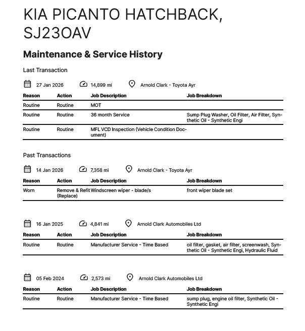 With an exceptionally low mileage of just 8017 miles for a 2023 model, this Kia Picanto DPi GT Line presents a superb ownership proposition. This one owner vehicle, finished in the desirable GT Line trim, boasts a fuel efficient 1.0L petrol engine and meets Euro 6 emission standards. Its MOT is valid until January 2027, offering peace of mind for the foreseeable future. Inside, youll find modern conveniences such as Apple CarPlay and Android Auto, both with voice control, allowing seamless integration of your smartphone. The automatic headlight control ensures optimal visibility, while the reversing camera system with dynamic guidelines makes parking effortless. This Kia Picanto stands out with its impressive fuel economy of 52 mpg, indicating it is more economical than many similar vehicles. Furthermore, its low CO2 emissions and low insurance group highlight its affordability and efficiency, making it an excellent choice for cost conscious drivers..1 x Coat Hooks - Rear, 12V Power Socket - Front, 16in Alloy Wheels, 6-Speaker System, 60-40 Split Folding 2nd Row Seats, 8in Touchscreen Display, ABS with Electronic Brakeforce Distribution - EBD and Brake Assist System - BAS, Advanced Driving Assistance Pack - ADAP, Air Conditioning, All-Round 3-Point Seatbelts, All-Round Height Adjustable Headrests, Android Auto with Voice Control, Anti-Theft Alarm System, Apple CarPlay with Voice Control, Automatic Headlight Control, Bi-Function Projection Headlights, Black Radiator Grille with Silver Paint Surround, Black and Red Accents - Front Door Armrest, Bluetooth with Music Streaming, Body Coloured Bumpers, Body Coloured Exterior Mirrors and Exterior Handles, Body Coloured Side Sill Mouldings, Centre Console Cupholders, Centre Console with Storage Box and Sliding Armrest, Child Safety Rear Door Locks, D-Cut Steering Wheel, Driver and Front Passenger Sunvisors with Vanity Mirror, Drivers Seat Height Adjustment, Electrically Folding-Adjustable and Heated Door Mirrors with LED Indicator Lights, Electronic Stability Control - ESC and Vehicle Stability Management - VSM, Emergency Stop Signalling - ESS, Engine Immobiliser, External Temperature Display, Front Cabin Light, Front Fog Lights, Front Passenger Airbag Cut Off Switch, Front Passenger Seatback Pocket, Front Seatbelt Height Adjusters, Front Seatbelt Pre-Tensioners and Load Limiters, Front and Rear Electric Windows with Drivers Auto Up-Down Function, GT-Line Styling Pack, Glovebox, Headlight Levelling Device, Heated Rear Window, High Gloss Lower Centre Fascia Trim - Door Armrest and Air Vents, High Mounted Brake Light, Hill-Start Assist Control - HAC, ISOFIX Child Seat Top Tethers and Anchor Fixings, Impact Sensing Auto Door Unlocking, LED Daytime Running Lights, LED Rear Fog Light, Leather Trimmed Steering Wheel with Leather Trimmed Gearshift, Locking Wheel Nuts, Luggage Area Light, Luggage Area Parcel Shelf, Motor Driven Power Steering - MDPS, Privacy Glass - Rear Windows and Tailgate, Rear Wiper-Washer, Refined Sports Front and Rear Bumper with Gloss Black Skid Plates - Twin Exhaust, Remote Central Locking with Folding Key, Reversing Camera System with Dynamic Guidelines, Satin Chrome Interior Door Handles, Seatbelt Reminder Warning, Side Impact Protection System, Sliding and Reclining Front Seats, Speed Variable Front Wipers, Steering Wheel Mounted Audio Controls, TMK - Tyre Mobility Kit, Tachometer, Tilt Steering Wheel Adjustment, Torque Vectoring Brake Base