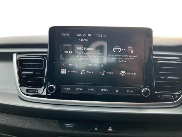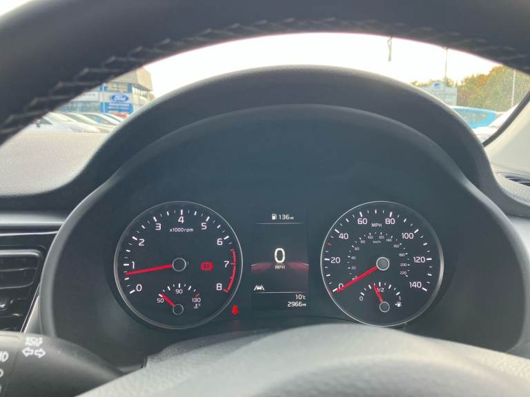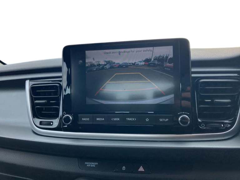 ..8'' touch screen, Apple car play/Android Auto, Cruise control + speed limiter, Digital clock, Electric power steering, Emergency call service, Emergency stop signalling system, Gear selection indicator, Manual speed limit assist (MLSA), Outside temperature display, Rear parking sensor, Reversing camera system with dynamic guidelines (Integrated into centre fascia screen), Tachometer, Tailgate, Trip computer, Voice control system, Windscreen washer level indicator, Intelligent Stop and Go, 6 speakers, Bluetooth connectivity including audio streaming, DAB Digital radio, Front USB port for media connection, Rear USB port, Steering wheel mounted audio controls, 3rd brake light, Aeroblade-type front wipers, Automatic lighting control, Bi-function projection headlights, Black grille with chrome surround, Body colour bumpers, Body colour door handles, Body coloured door mirrors, Cornering light, Electric adjustable/heated/folding door mirrors, Front electric windows with driver's auto up/down function, Headlamp levelling, Heated rear window, LED daytime running lights, LED indicators in door mirrors, Projection front fog lights, Rain sensor, Rear electric windows, Rear fog lamp, Rear side wing doors, Rear wash/wipe, Speed variable front wipers, Tinted glass, Welcome and follow-me home light functionality, 3 passenger assist grips, 3 seat bench in 2nd row, 60/40 split/folding 2nd row of seats, Air conditioning, All round height adjustable headrests, Centre Console with Storage Box and Sliding Armrest, Dash illumination dimmer switch, Driver's seat height adjuster, Driver/passenger sunvisors and illuminated vanity mirrors, Front and rear door map pockets with bottle holder, Front passenger seatback pockets, Front USB charger port and 12V socket, ISOFIX top tethers and lower anchor points, Leather trimmed gearshift, Leather trimmed steering wheel, Load area light, Luggage area parcel shelf, Luggage hooks, Overhead console with sunglasses holder, Premium cloth upholstery, Silver interior door handles, Single front passenger seat, Tilt/telescopic adjustable steering wheel, Advanced driving assistance pack - Rio, 3-point front seatbelts, 3x3 point rear seatbelts, ABS with Electronic Brakeforce Distribution (EBD) and Brake Assist System (BAS), Automatic unlocking of doors in case of impact, Cornering brake control (CBC) and Straight line stability (SLS), Electronic stability control (ESC) and vehicle stability management (VSM), Front seatbelt pretensioners + load