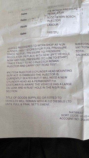 This is being sold as spares or repair. Injector 3 has blown out and took some of the cylinder out, so needs a new head. See the attached report form garage. MOT will run out end off the month. Will need recovering as the temporary fix to the injector could go any time.