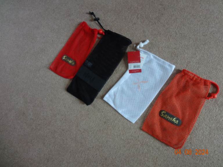 Four Dance Shoe Bags in different coloured mesh material, one brand new with label attached, draw string, excellent condition £2 for the four