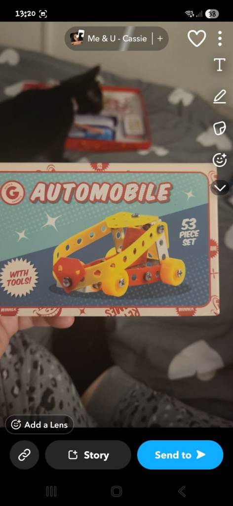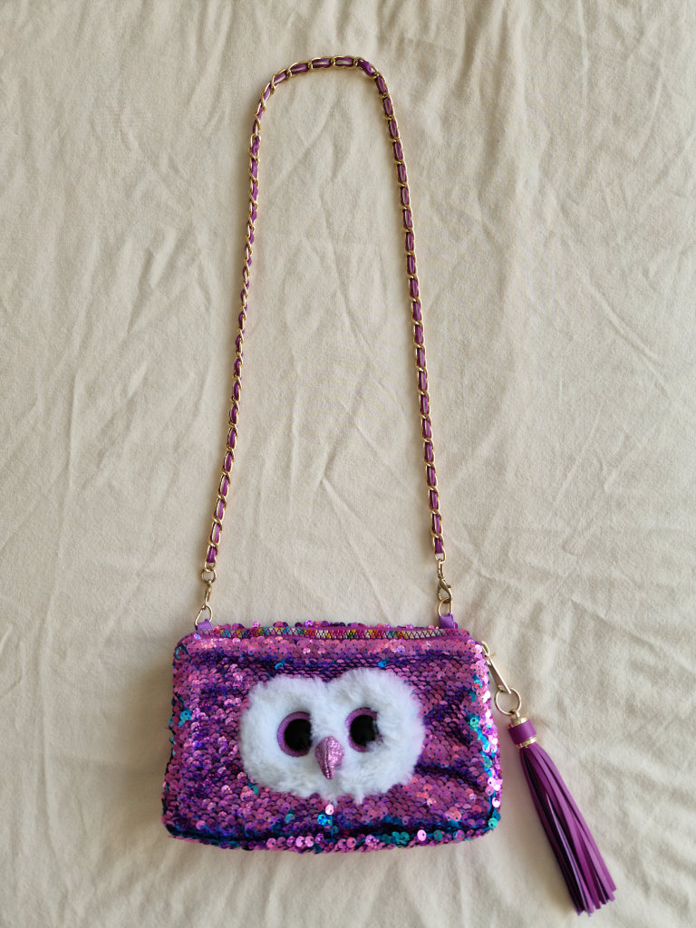 Features a shimmery finish with blue and silver sparkle details on the front.