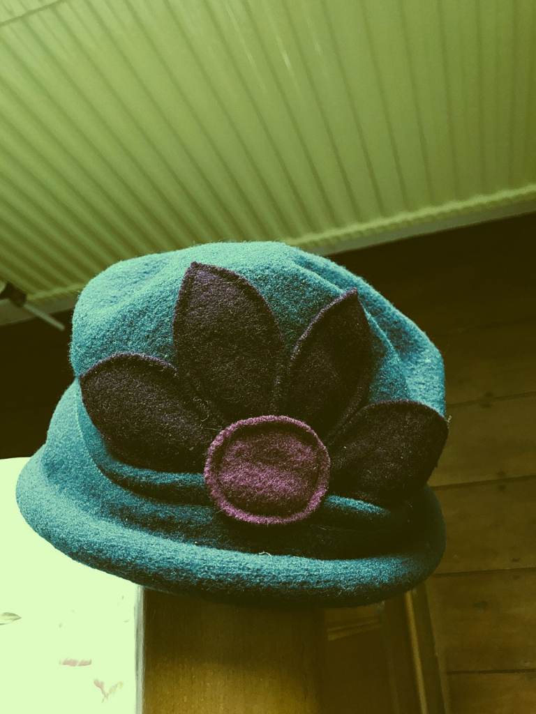 Older child's felt hat approx 22 inches (57 cms) inside circumference - like new. Colour is paler than first photo - turqoise/jade, with purple & pink decoration. Collection near Crewkerne (TA18 7SE) or can post. Possible free delivery Bridport orBeaminster.
