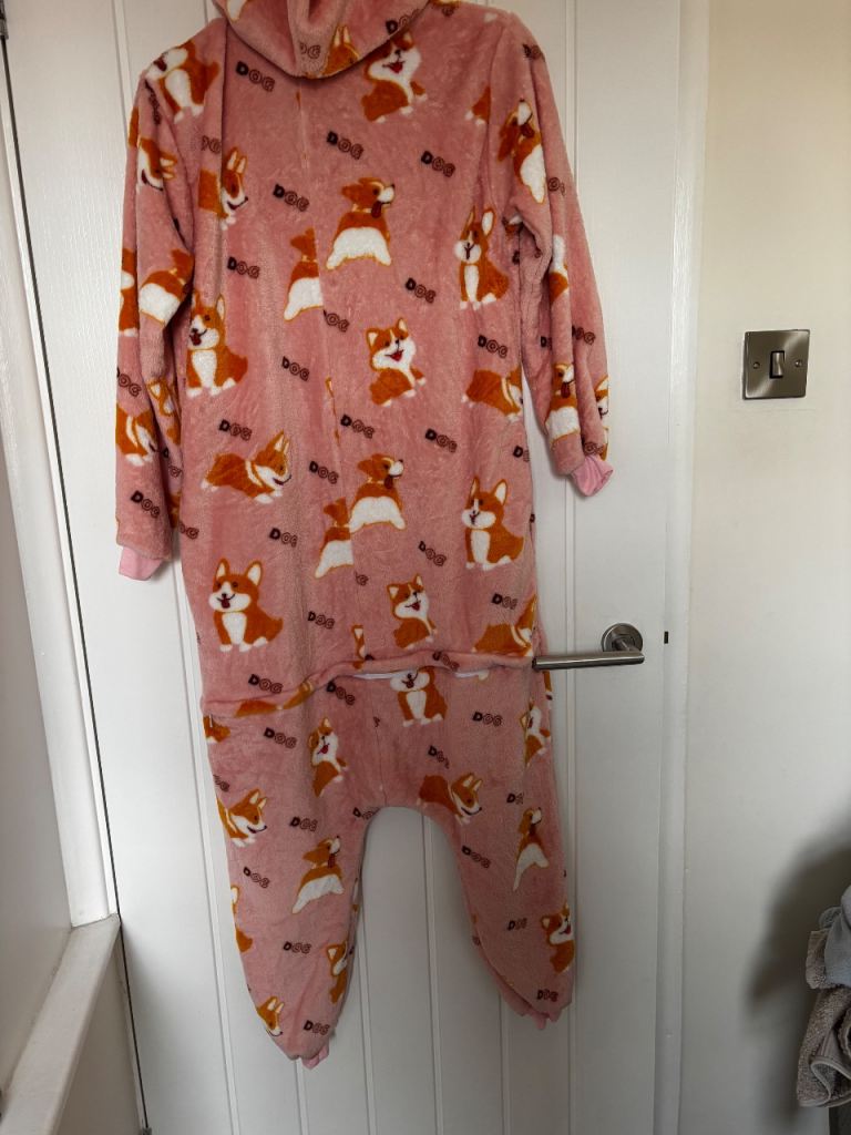 Hi! 🐶 Selling this really cute and cosy pink fluffy onesie featuring tons of happy little corgi dogs