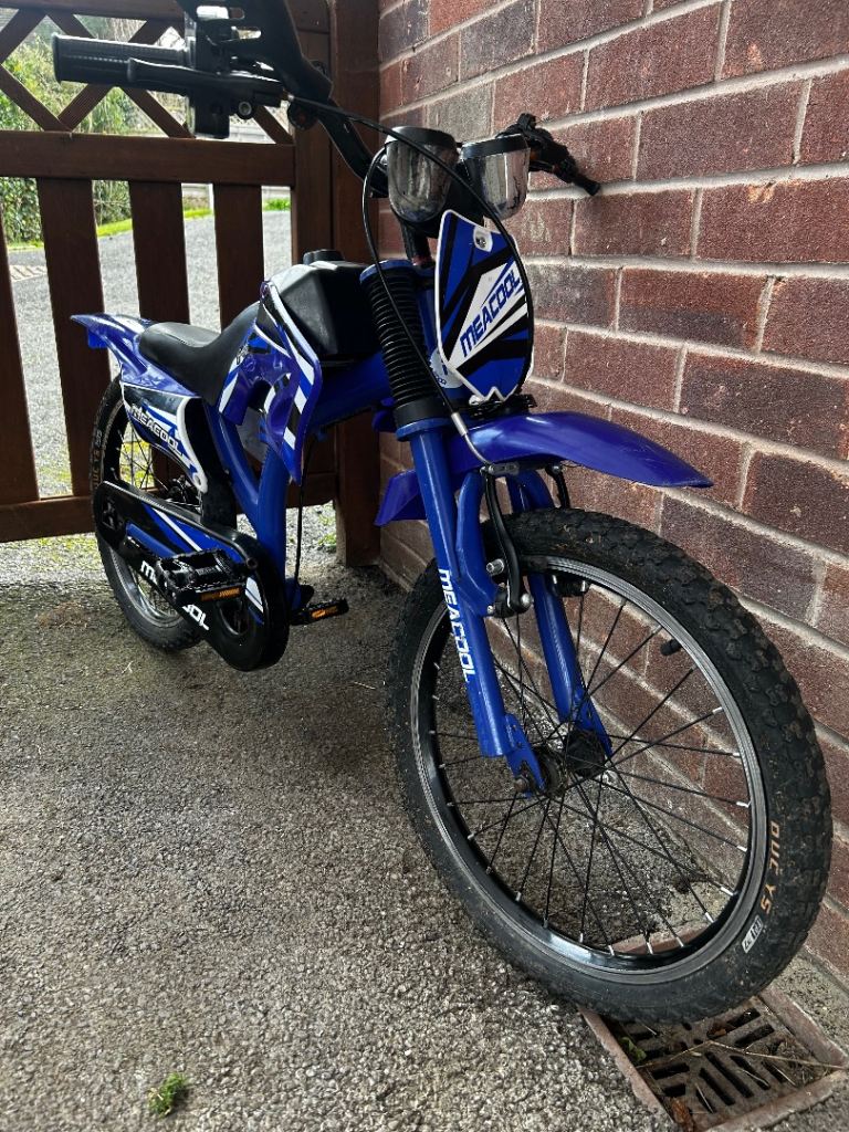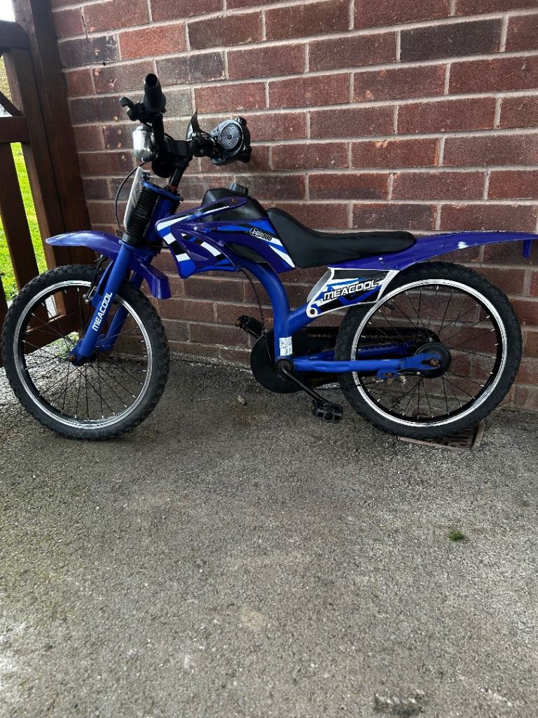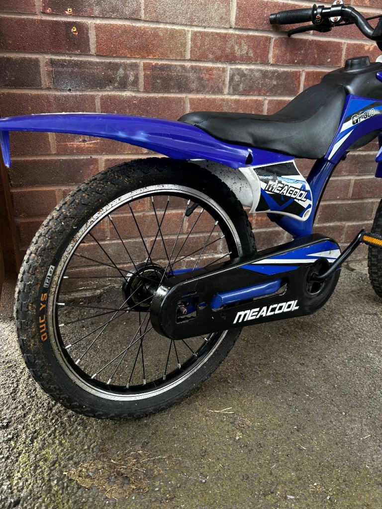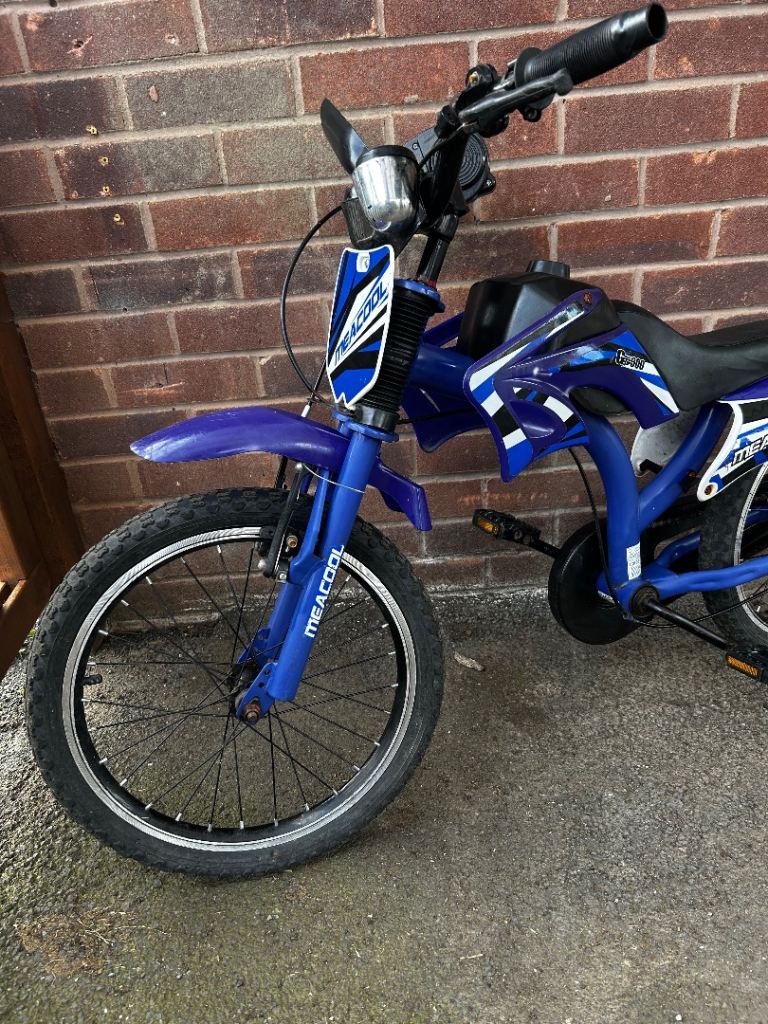 Meacool, moto x style bike, 14 inch wheels, single cog. Grandson sadly outgrown, hopefully moving onto petrol bikes soon lol. Great confidence giver. Tyres need pumping up. Priced to sell