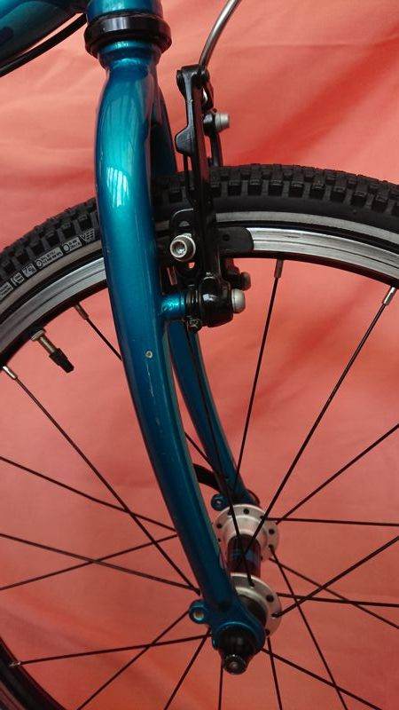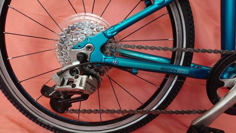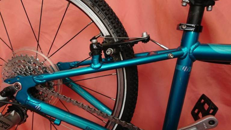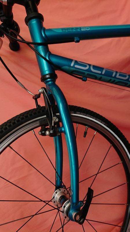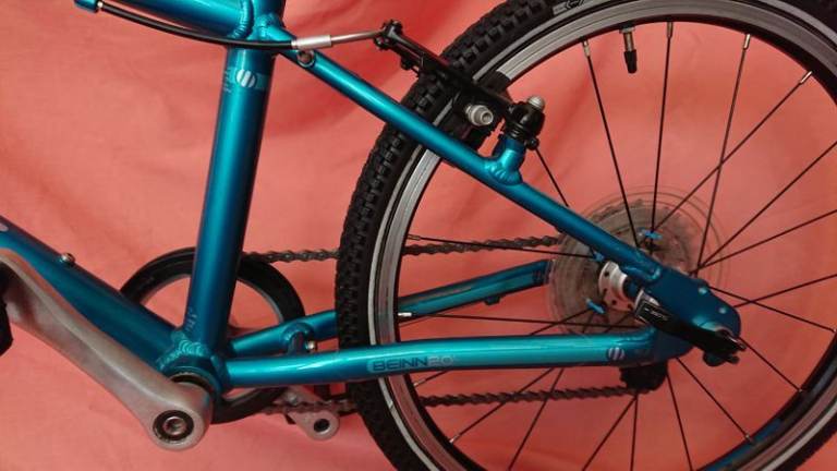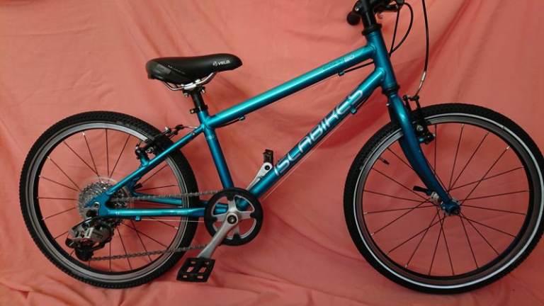 Techs: Weight about 7.5Kgs.; aluminium frame; 20”aluminium wheels; Twist grip shift; 7 speed 32T chainring, 11-34T cassette; aluminium mini-V brakes, Islabikes aluminium micro-levers; upgraded saddle.