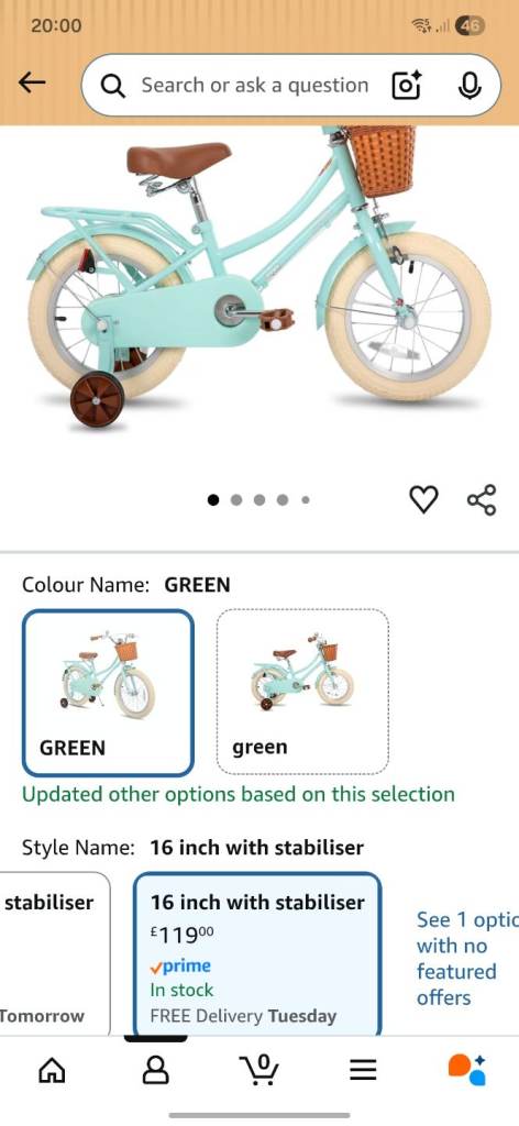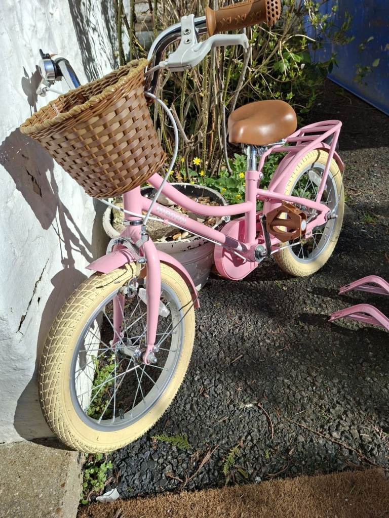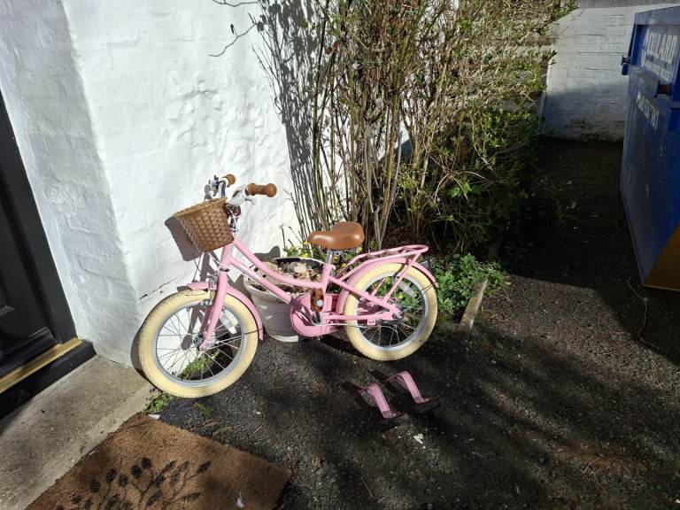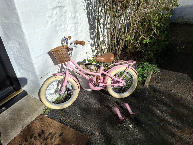 16 inch Stitch Pink kids bike with basket and stabilisers. Great condition as barely used. Still selling on Amazon (see pic)