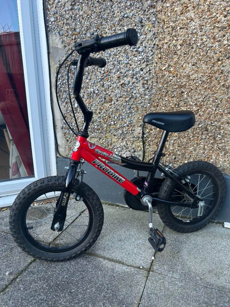 Boy's first bike for learning to ride. Red and black frame. 14 inch wheels. Adjustable saddle height. With stabilisers.