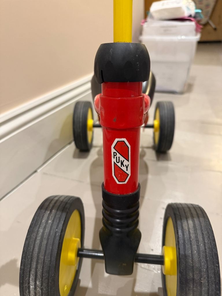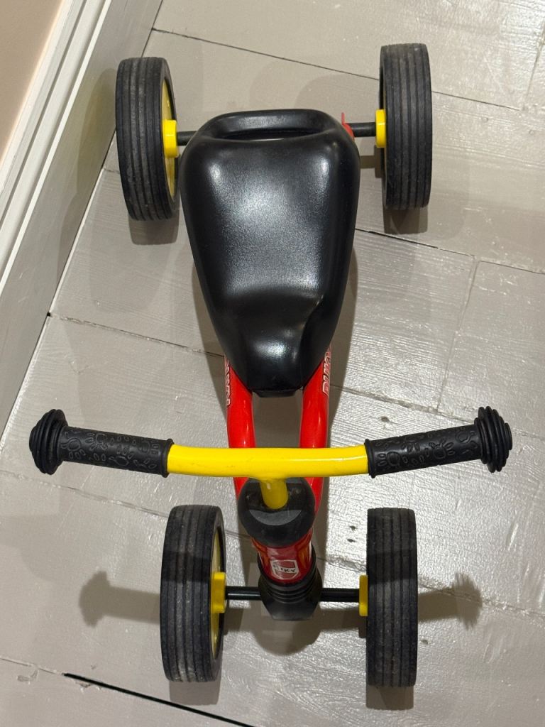 Lovely red and yellow puly toddler bike. Sturdy and good quality.