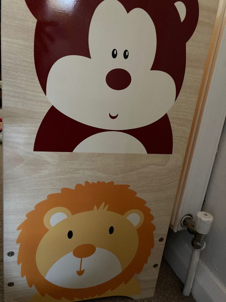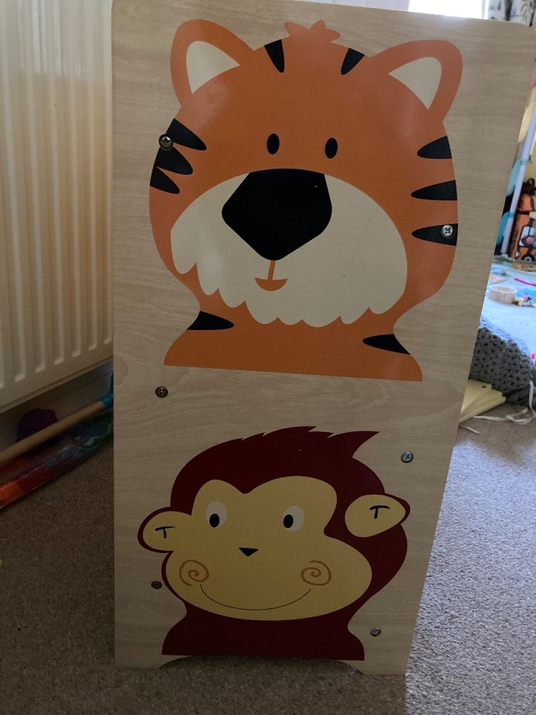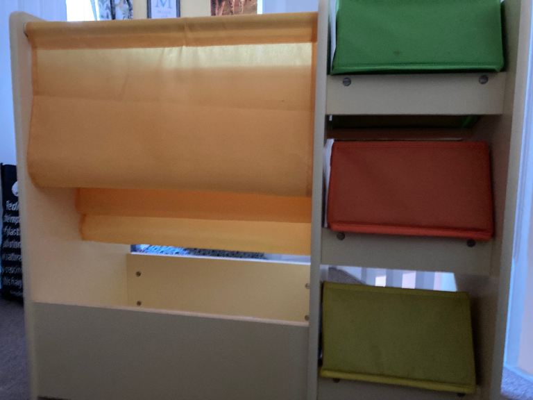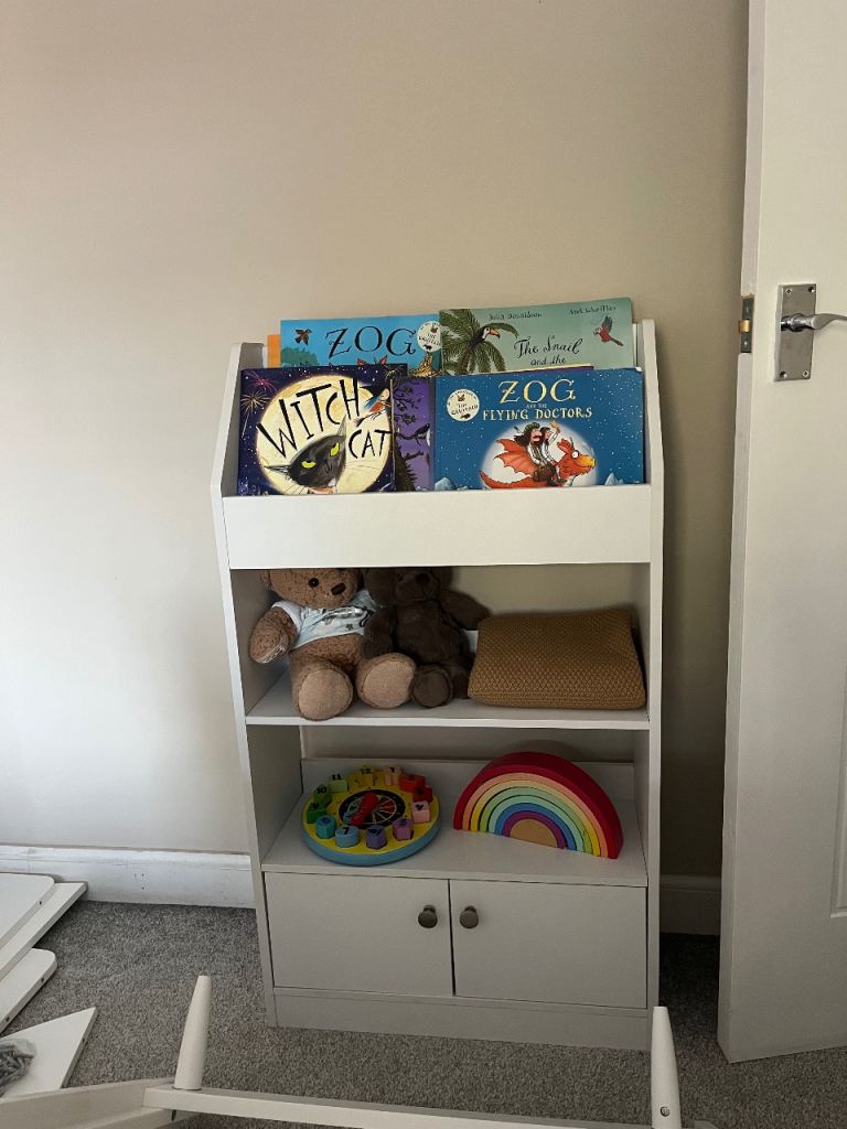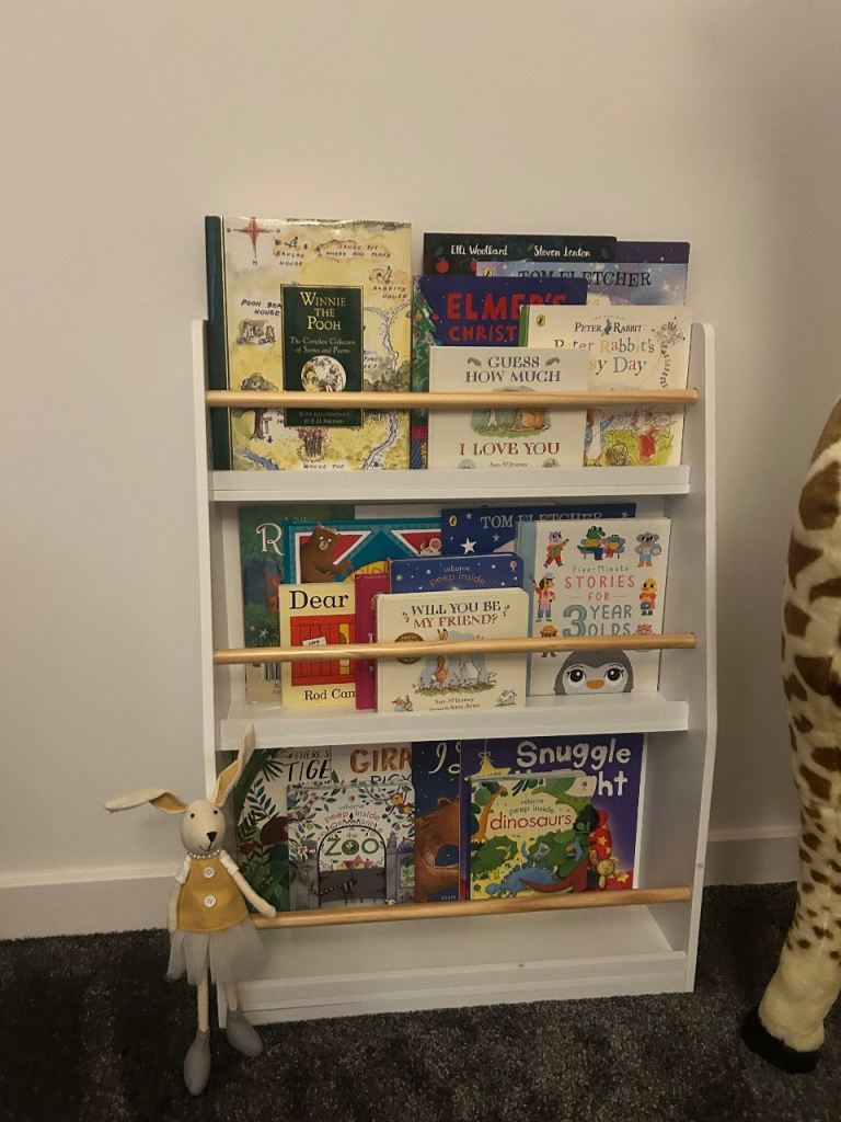 Shelf for picture books with shelves along the side and the bottom for other items or smaller board books. Bright but neutral colours and animals down the sides.