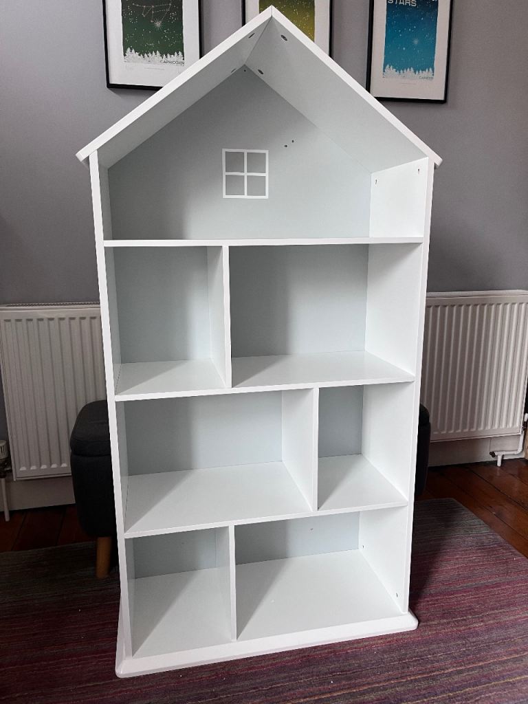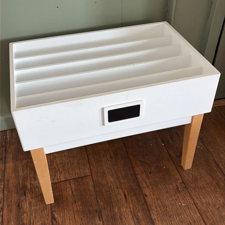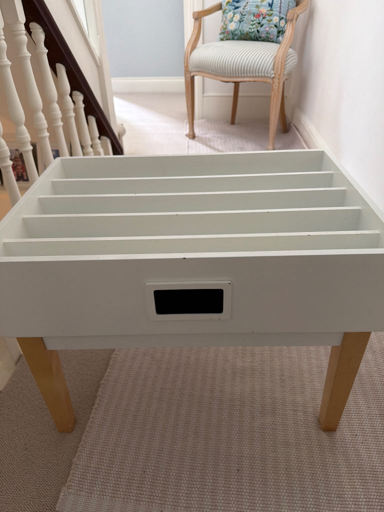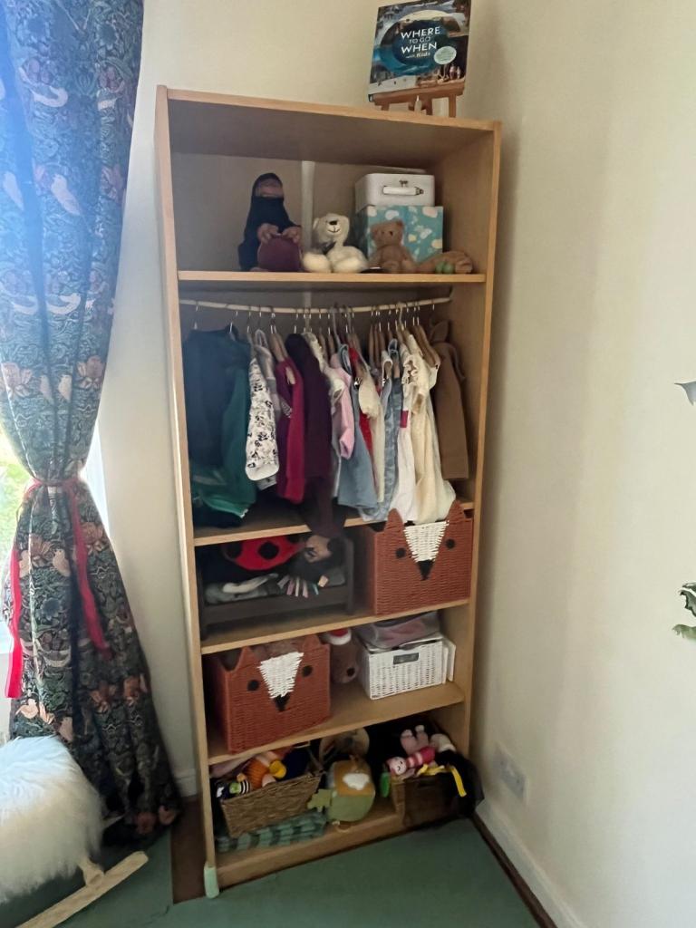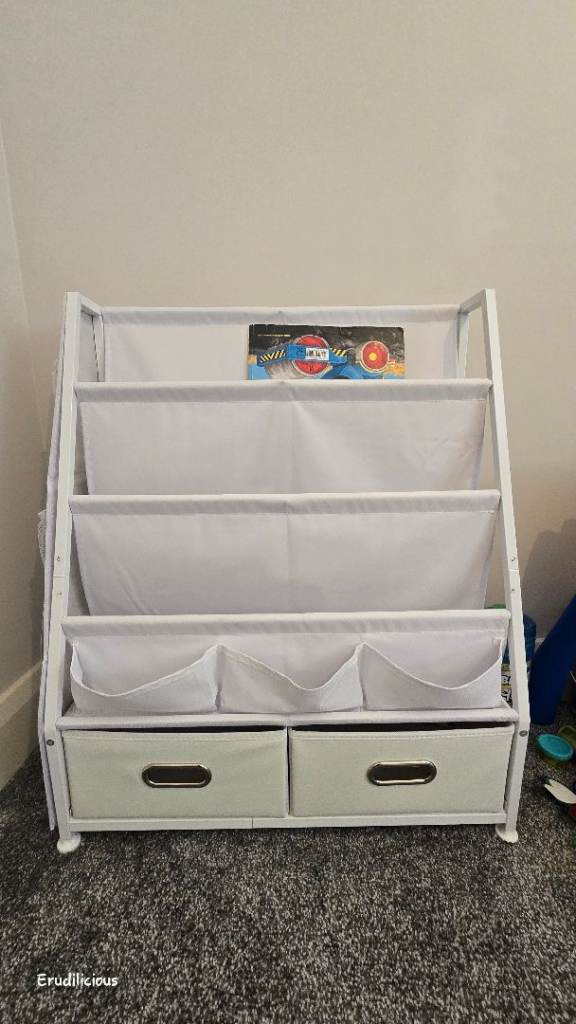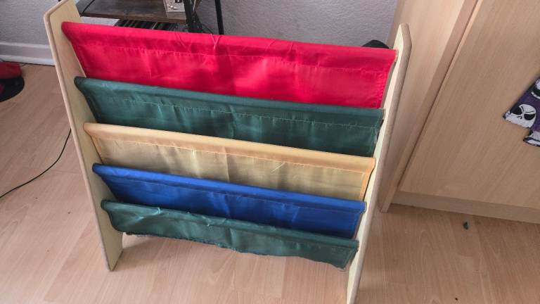 Shelf for picture books with shelves along the side and the bottom for other items or smaller board books. Bright but neutral colours and animals down the sides.