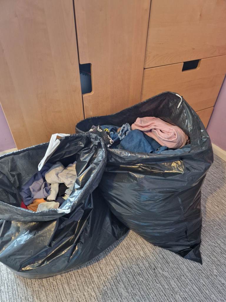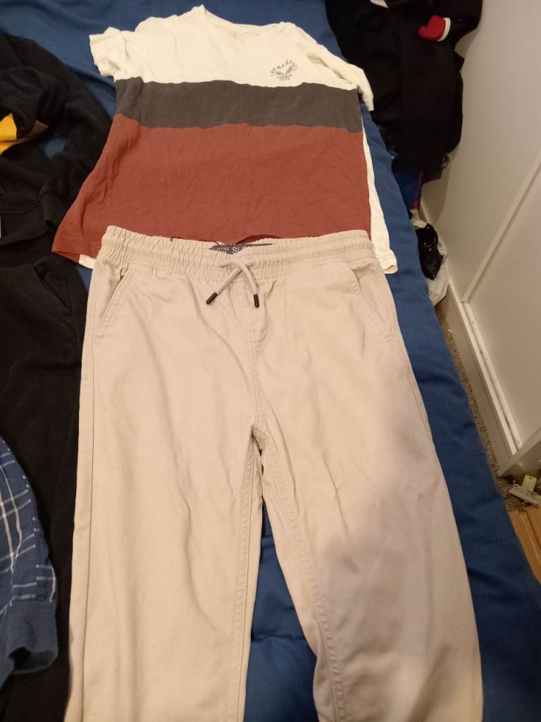 A boys clothing bundle age 11-12. Includes 2 pairs of bottoms, 2 t-shirts, a jacket and a pair of pyjamas. Good condition. Pickup also available from Meir ST3