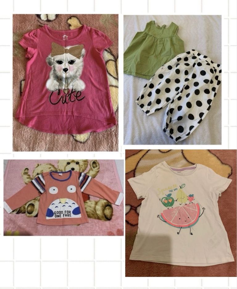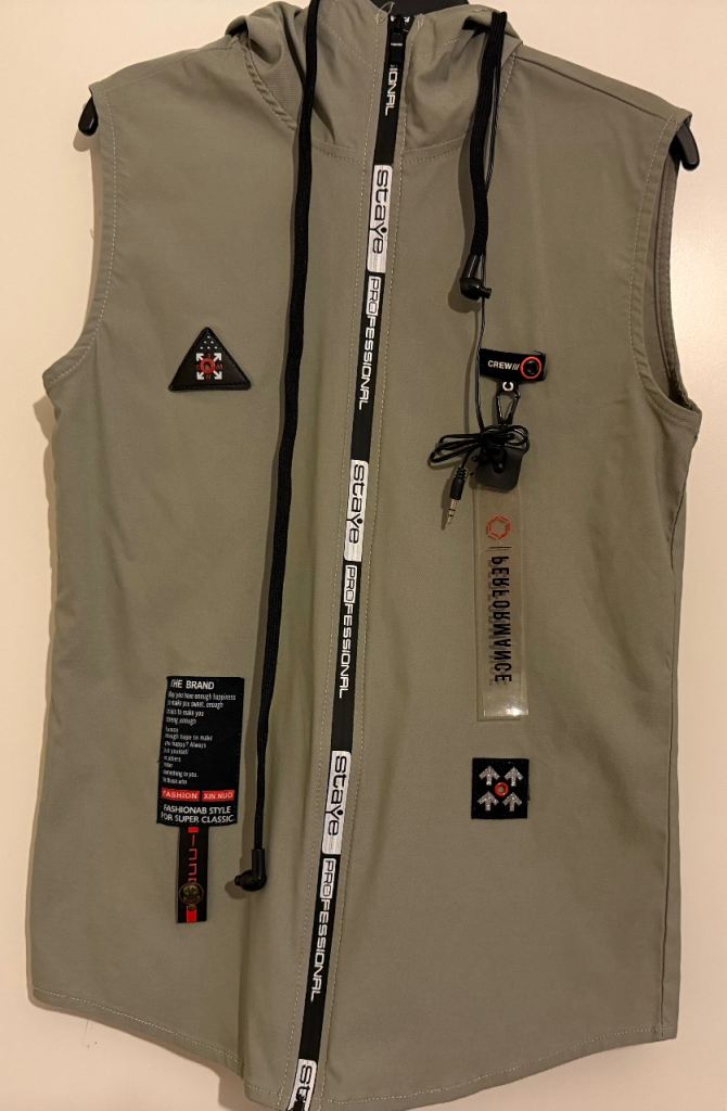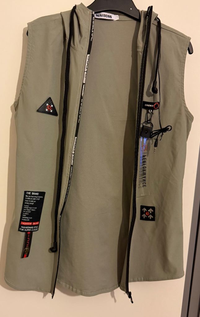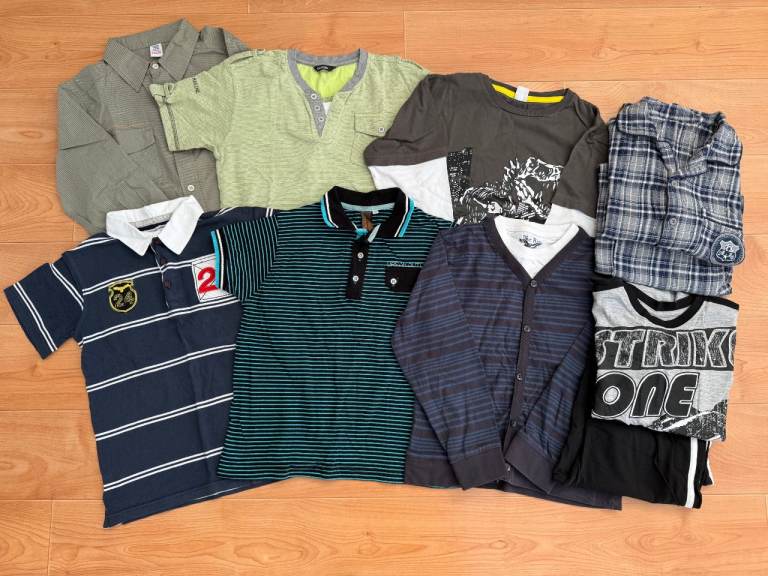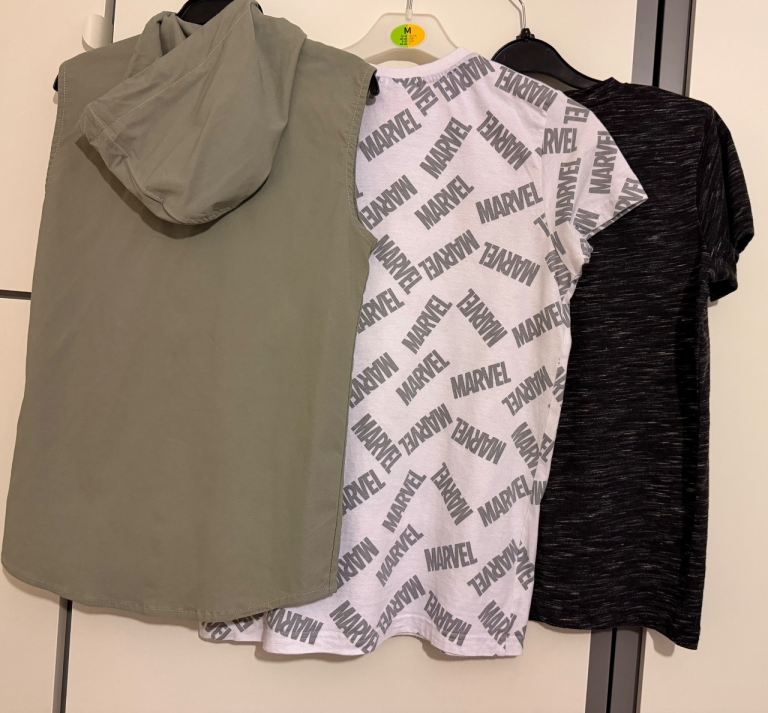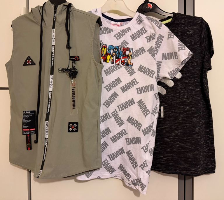 Boys clothes for size 11-12 years/152cm. They are different brands. The white marvel T-shirt is 11-12 years and the black T-shirt is for 12 years. The sleeveless jacket is for 11-12 years, very light and good for summer. The sleeveless jacket material is stretchy and has earphones. The earphones have not been used however, one earbud does not work. They look exactly like the photos.