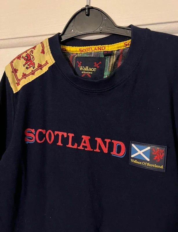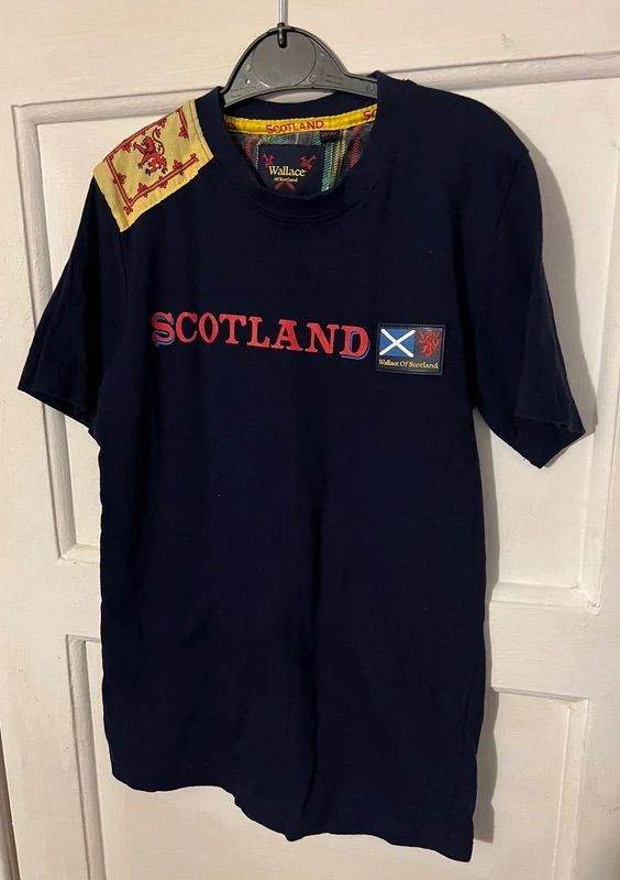 Wallace of Scotland kids navy t-shirt age 9-10 years. Worn a few times, good for celebrating upcoming World Cup etc. Plastic badge detail on it with image of the Scotland flag. £12
