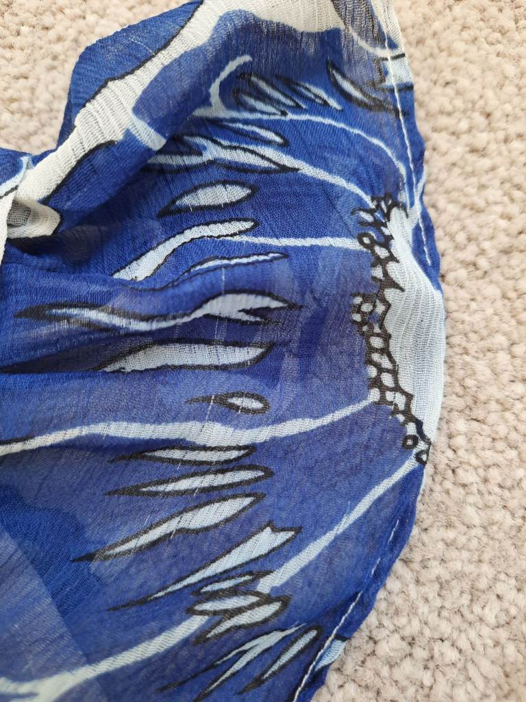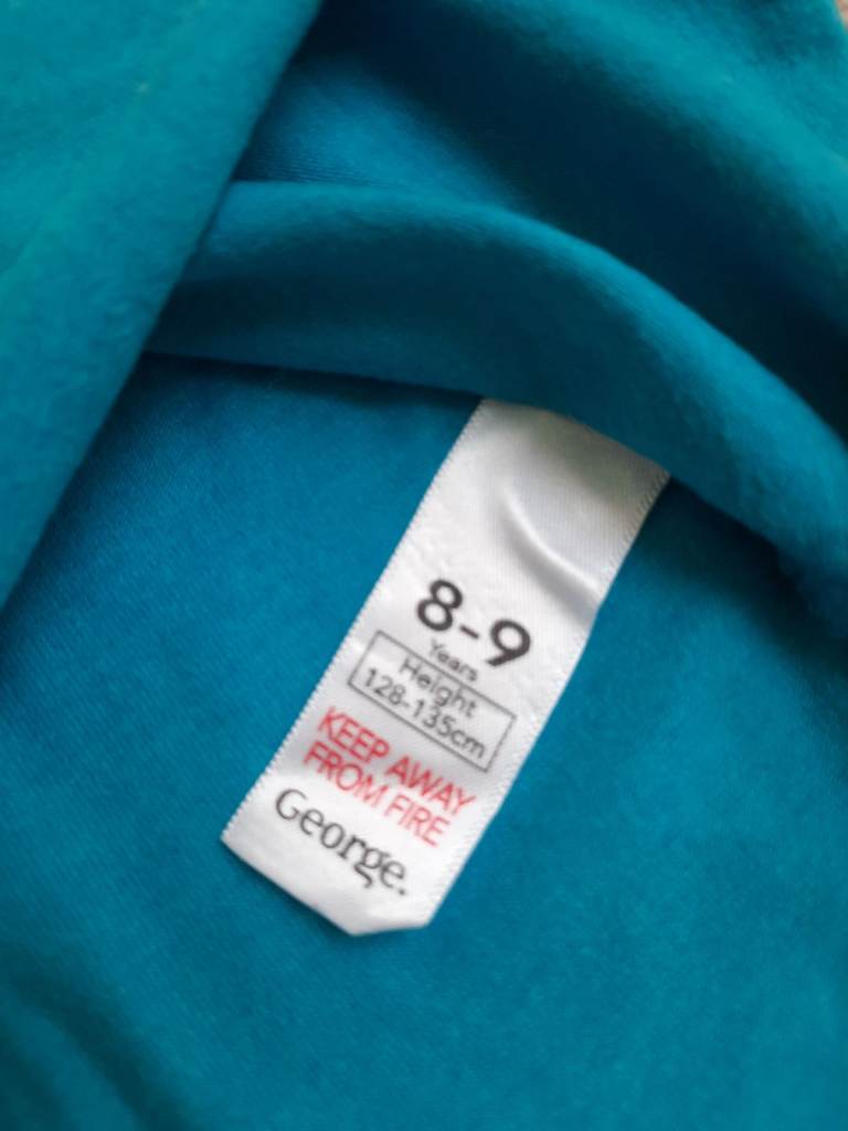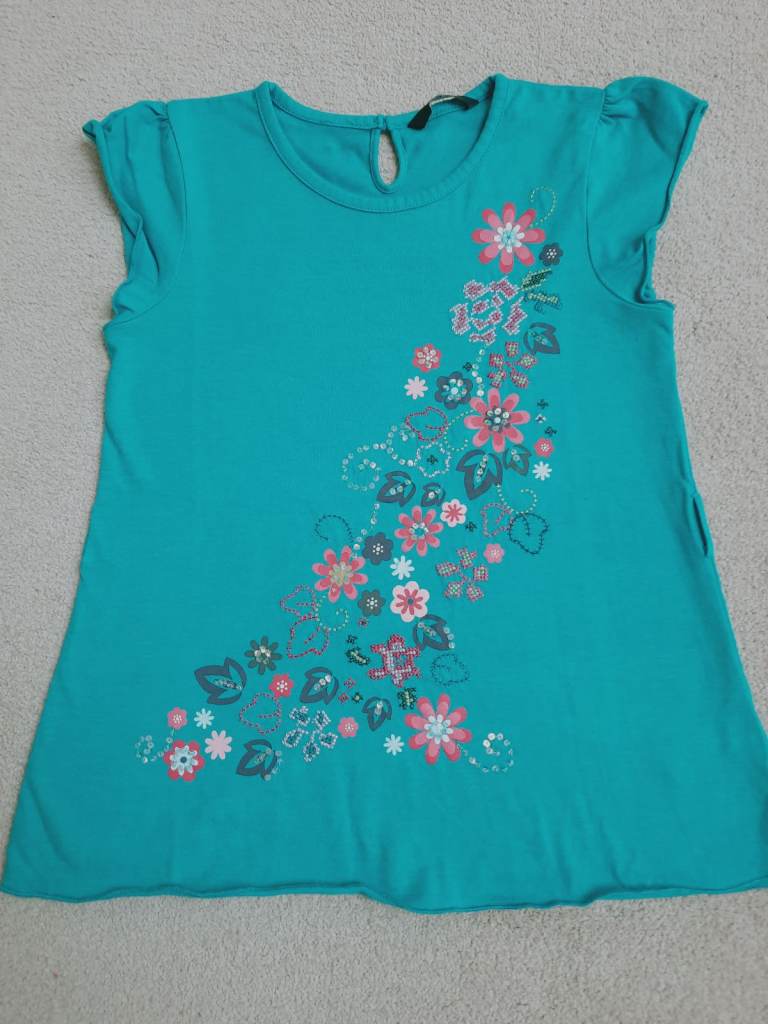 Turquoise t-shirt with flower design. The top originally had a belt, but I can't find it. There are two belt loops on either side - see photo. Age 8-9. George.