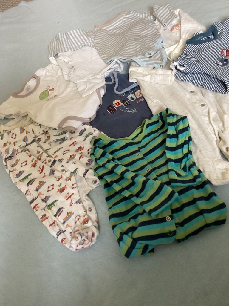 Bundle consists of trousers, shorts, tee shirts, jumpers, coats, romper suits, Babygrows. All good condition. Age range is 0 to 9/12 months. M&S, Mothercare, Next, Pumkin Patch, Cherokee, and many more. ( have to put 2-3 on chart as no place for 0-1)