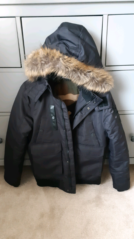 Black bomber jacket for child age 12. Unworn from a smoke free house. Detachable fur trim hood. Fleece lined. Originally £200.