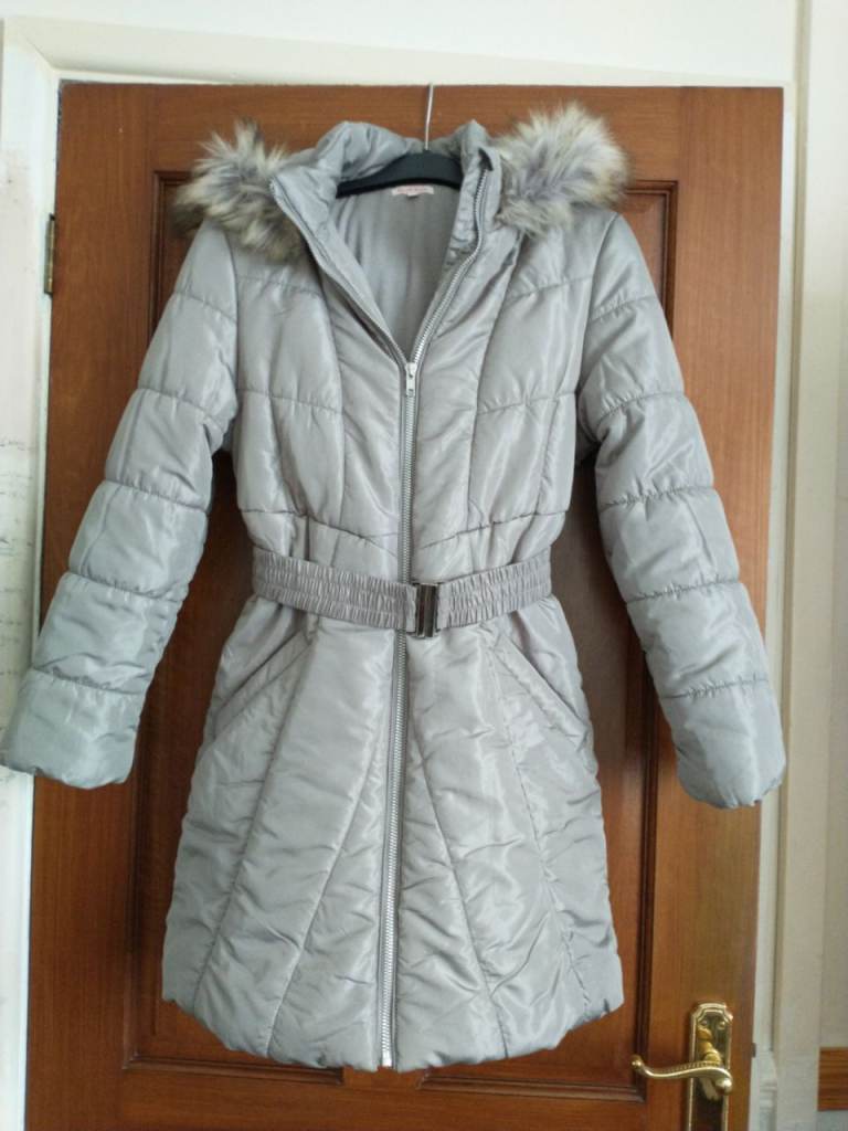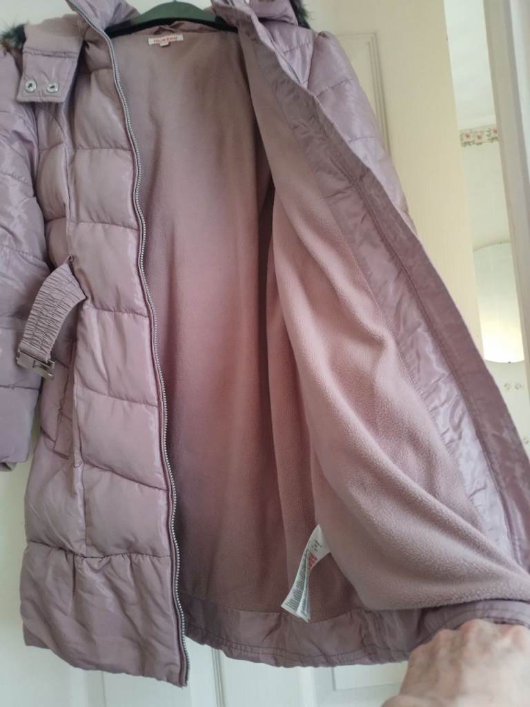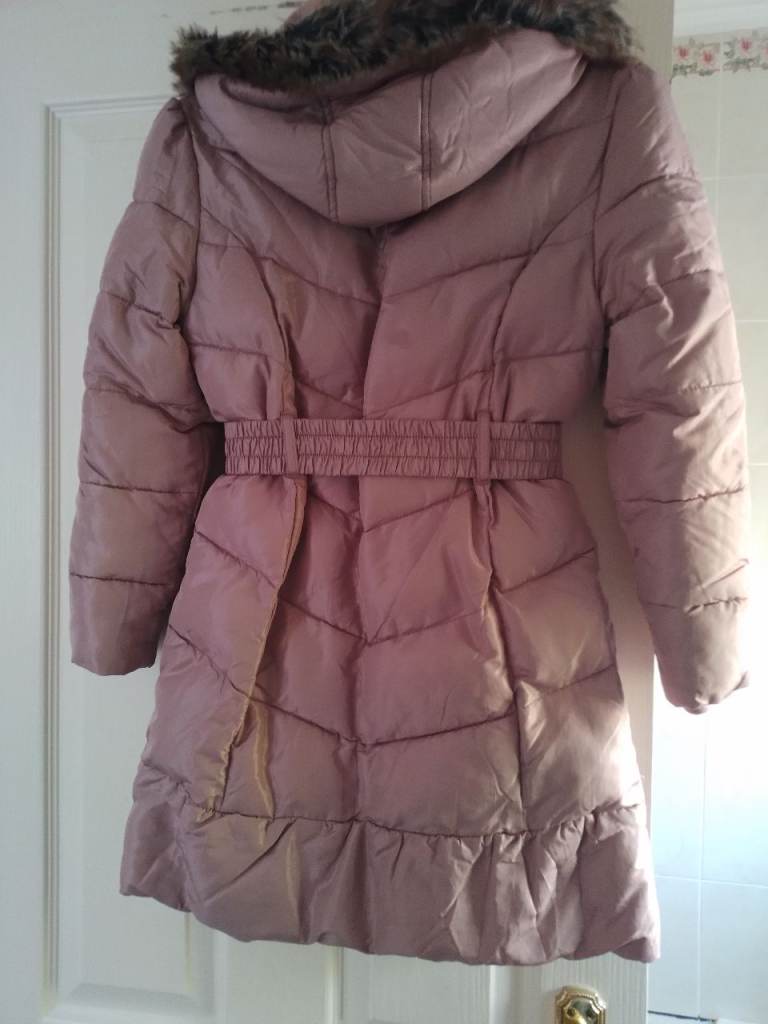 GIRLS' QUALITY, SOFT PADDED, HOODED COAT. FULLY LINED. HEIGHT 152cms. FULLY LINED. KNEE-LENGTH. ELASTICATED BELT WITH METAL CLASP. FUR TRIM ON HOOD. MINK/NATURAL COLOUR. 40 wash. 'As new'condition.