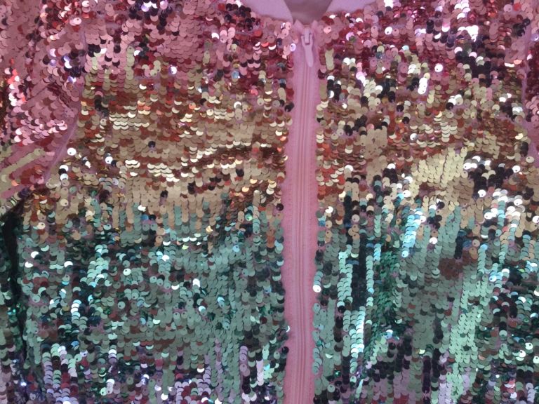 Light Spring / summer jacket with zip up front. Pink, gold, jade and purple sequins. Soft comfortable pink lining. Very good condition. Collect Mangotsfield.