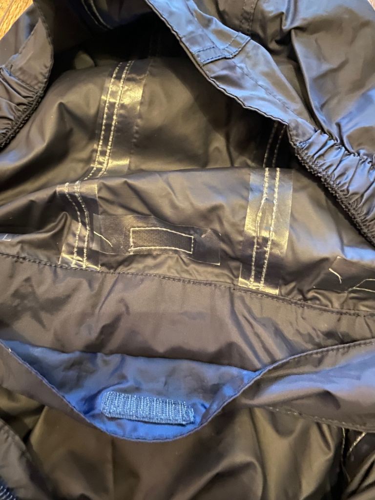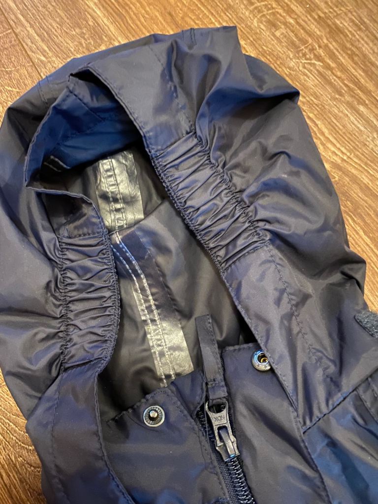 Waterproof, breathable, taped seams, pack away hood.