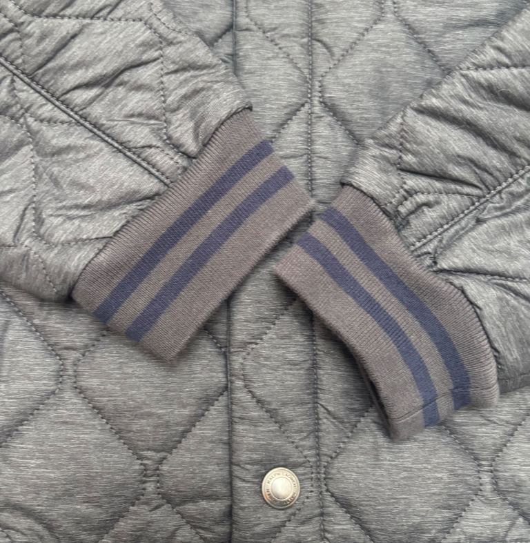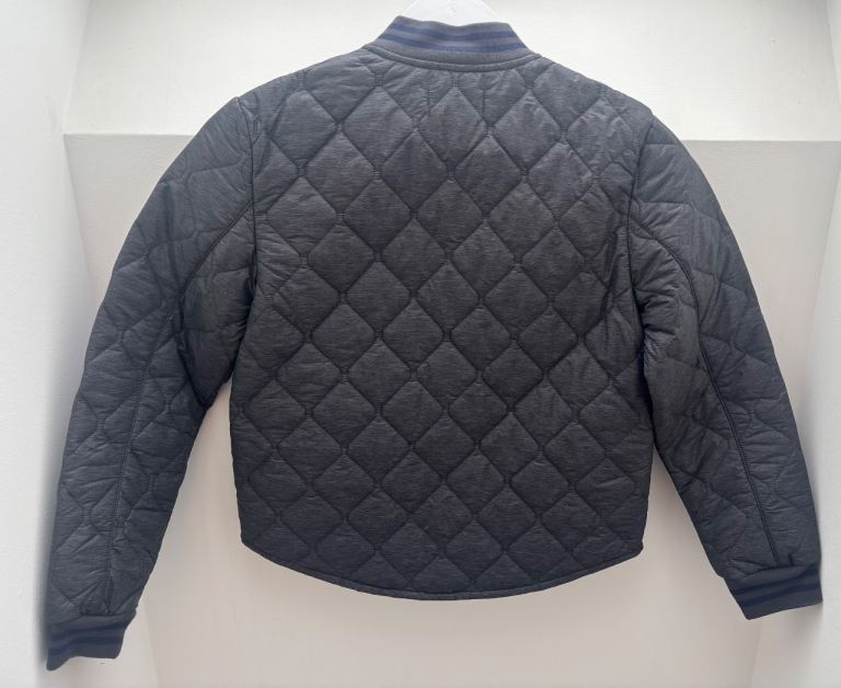 Grey bomber style jacket with navy trim at collar and cuffs. Blue diamond inside.