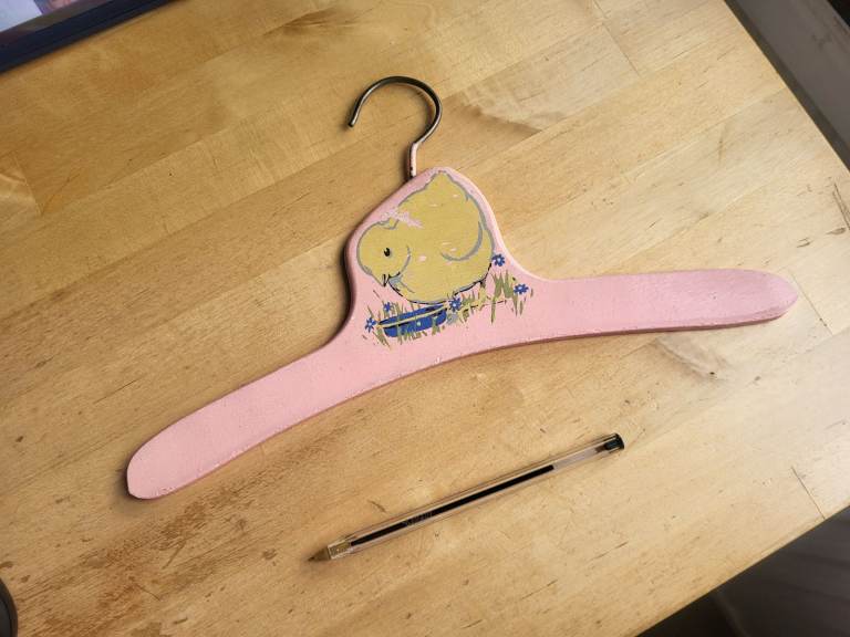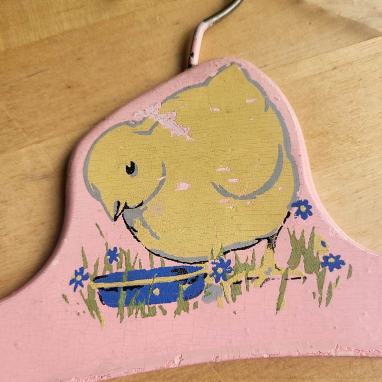 Vintage child's coat hanger with a cute painted chick design on one side.