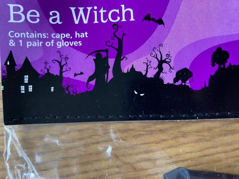 Witch dress new unused large kids size packet says (11-14) includes dress hat and belt. Hasn’t been opened so maybe fit next size down looking at the image on packet.