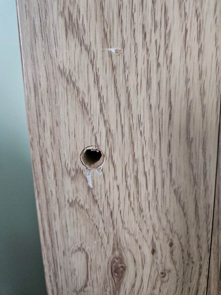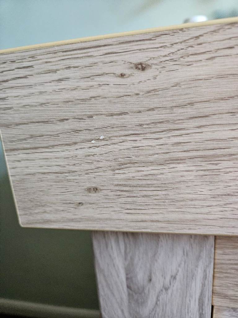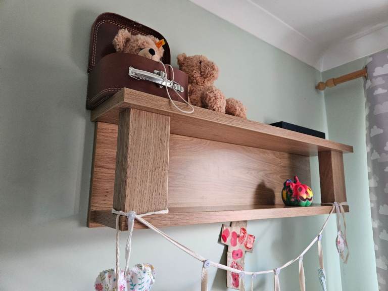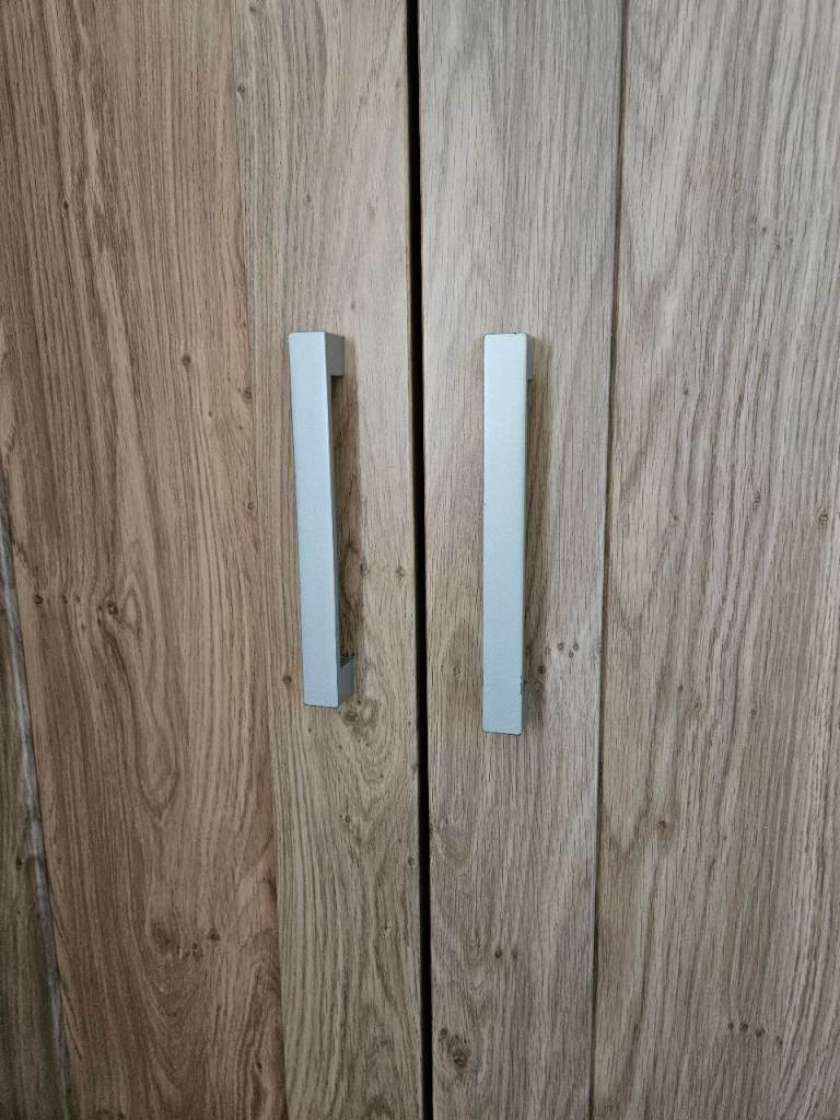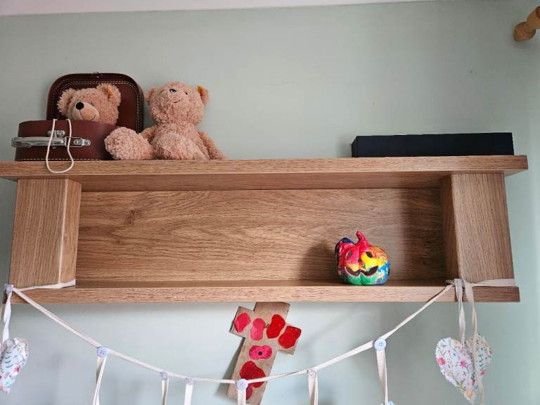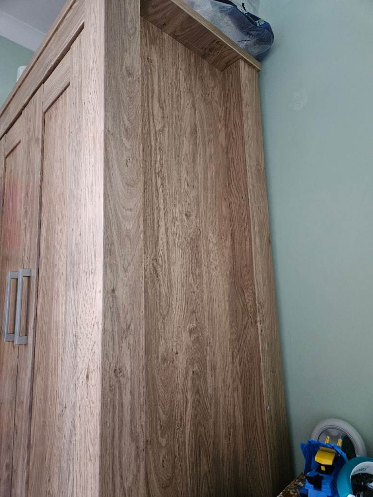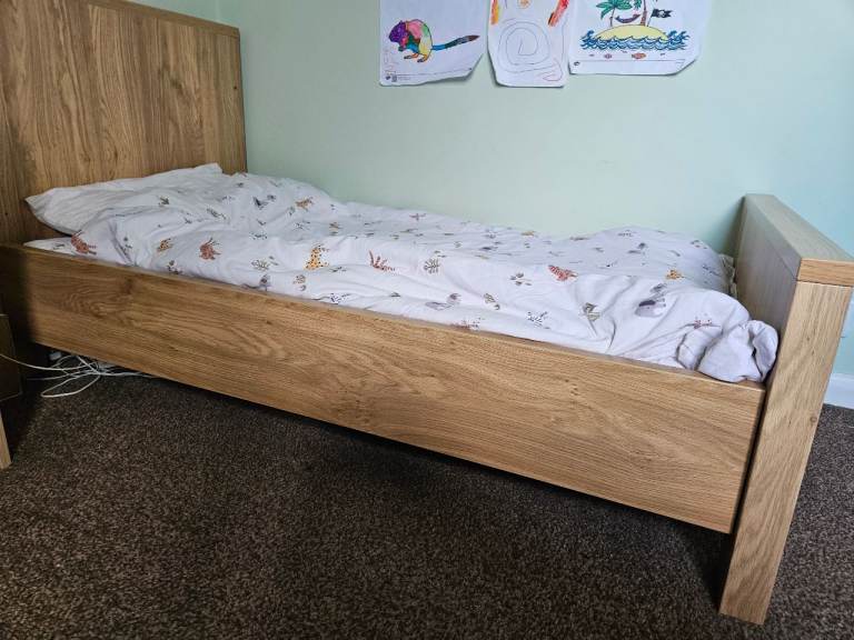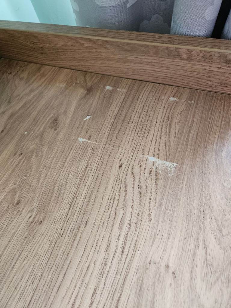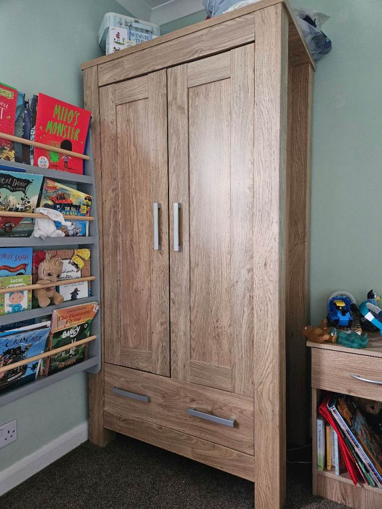Wardrobe, drawers, shelf and cot bed, all in good condition. Odd little mark as shown. Top of drawers has a removable change table top. There are a few marks on this as shown but easily covered with a change mat. The cot bed is missing one side to turn it into a cot. Mattress, duvet and covers all included if wanted.