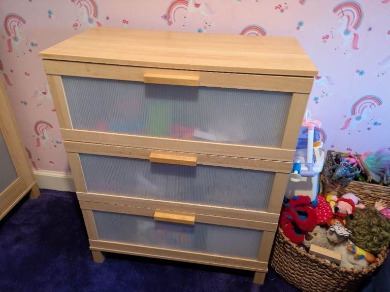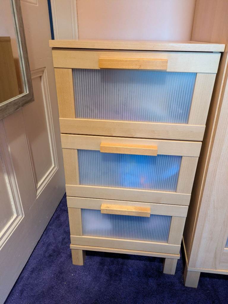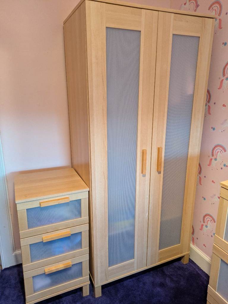 Wardrobe and two chests of drawers in pine veneer. Good condition. Smoke free home