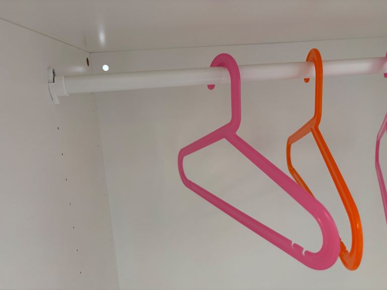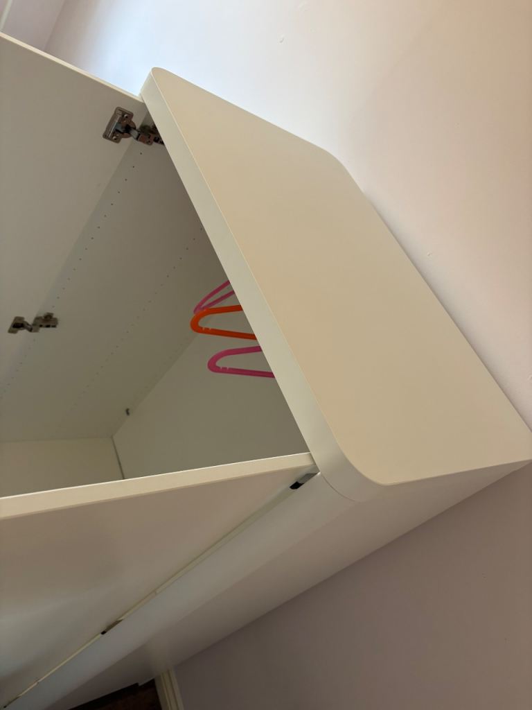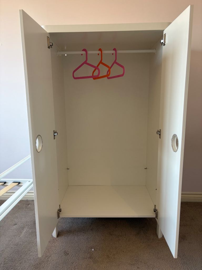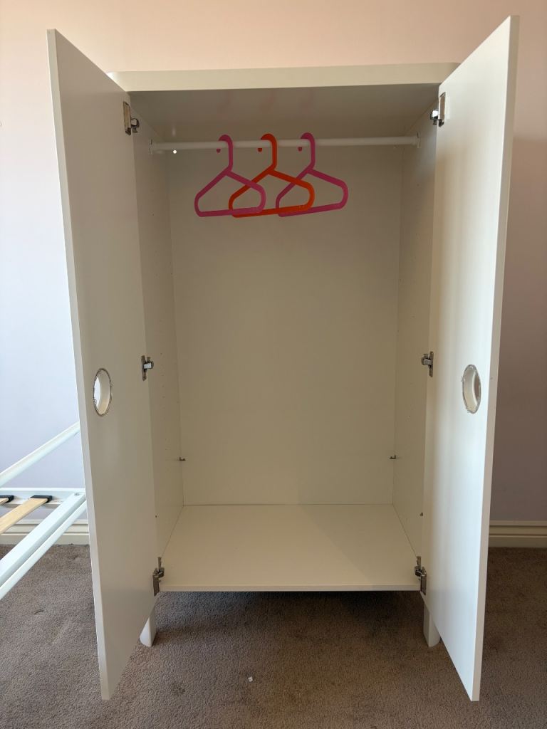 Good condition white kids toddler wardrobe with 40ish colourful ikea kids hangers included. Smoke and pet free home.