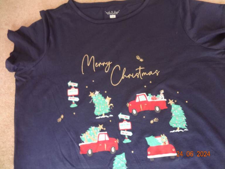 Girls/Ladies Christmas Nightshirt in navy with Christmas decoration on front, round neck, short sleeves, size 12/14, never worn so excellent condition £1