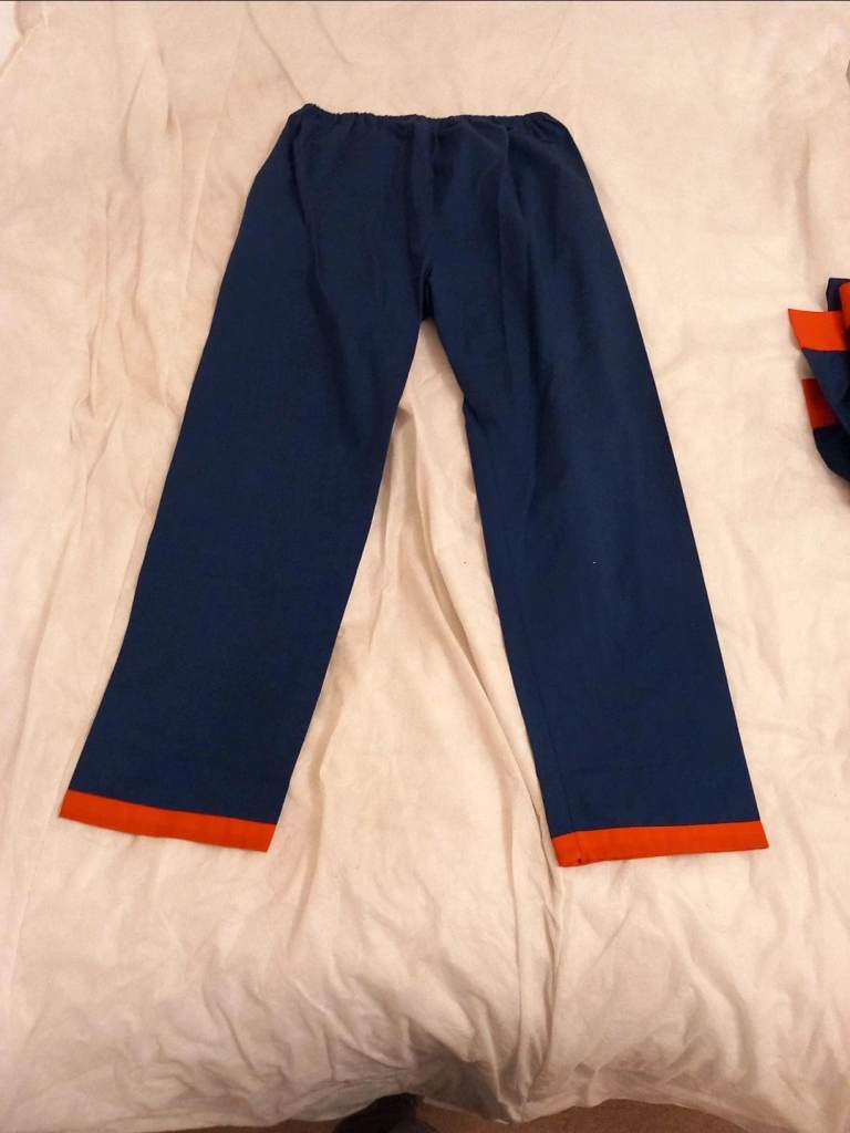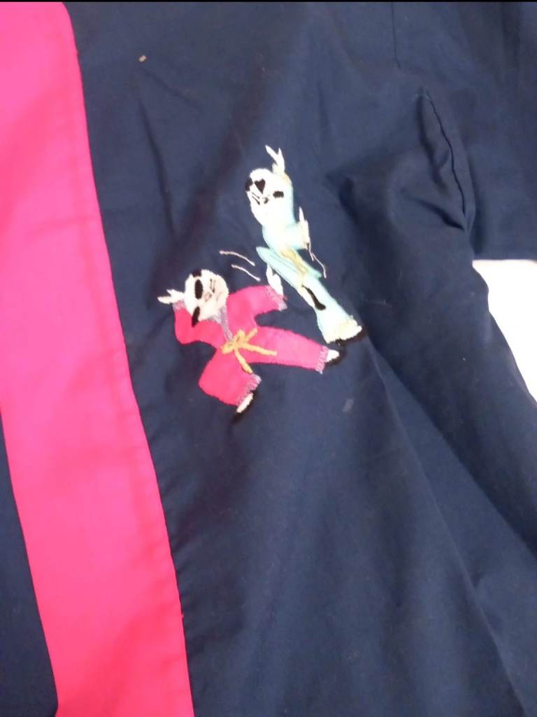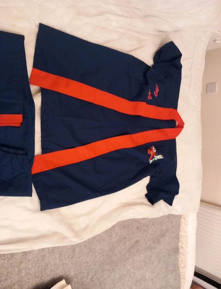 Details: Navy blue with vibrant red/orange trim. Features beautiful embroidery of pandas practicing martial arts (Kung Fu/Karate).