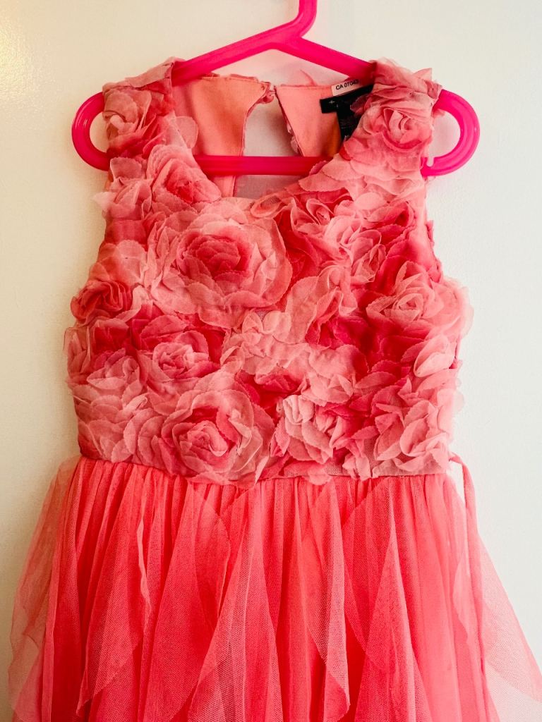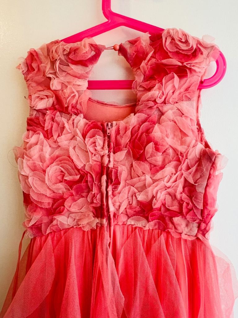 Coral pink dress with a sleeveless design and pretty floral details on the top. The skirt is made of soft, layered tulle that gives it a flowy, ruffled look.