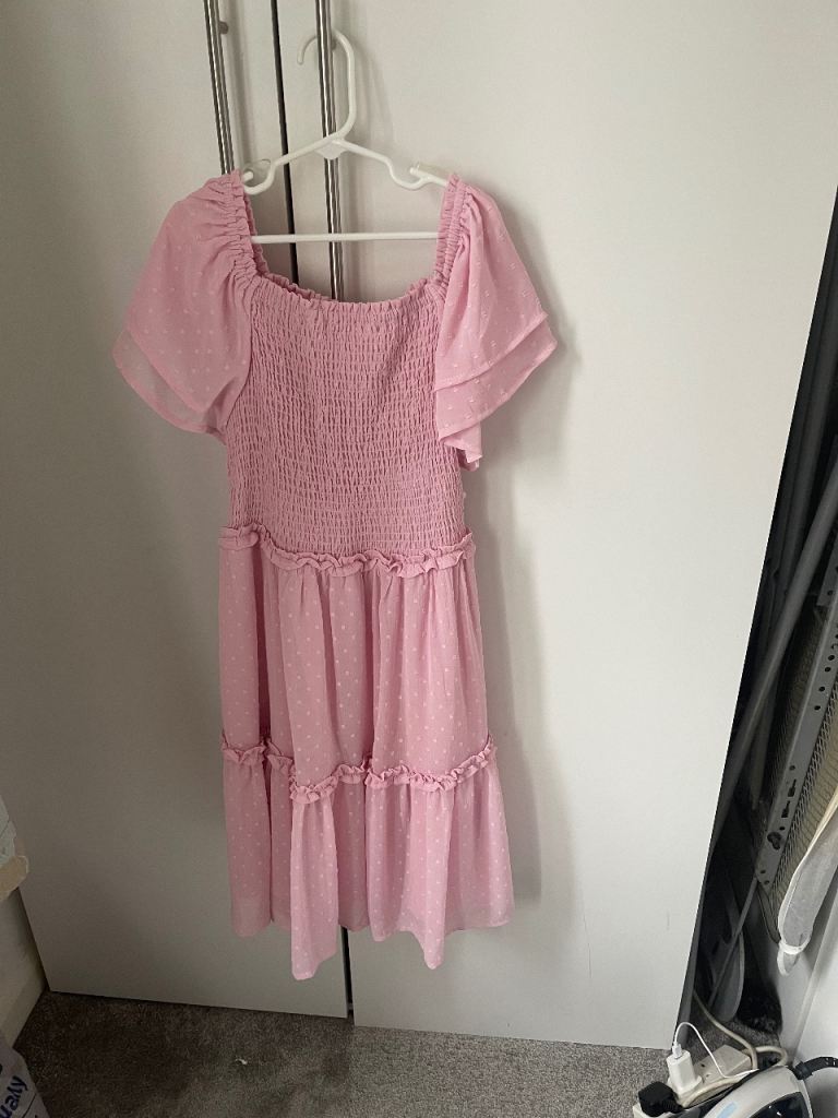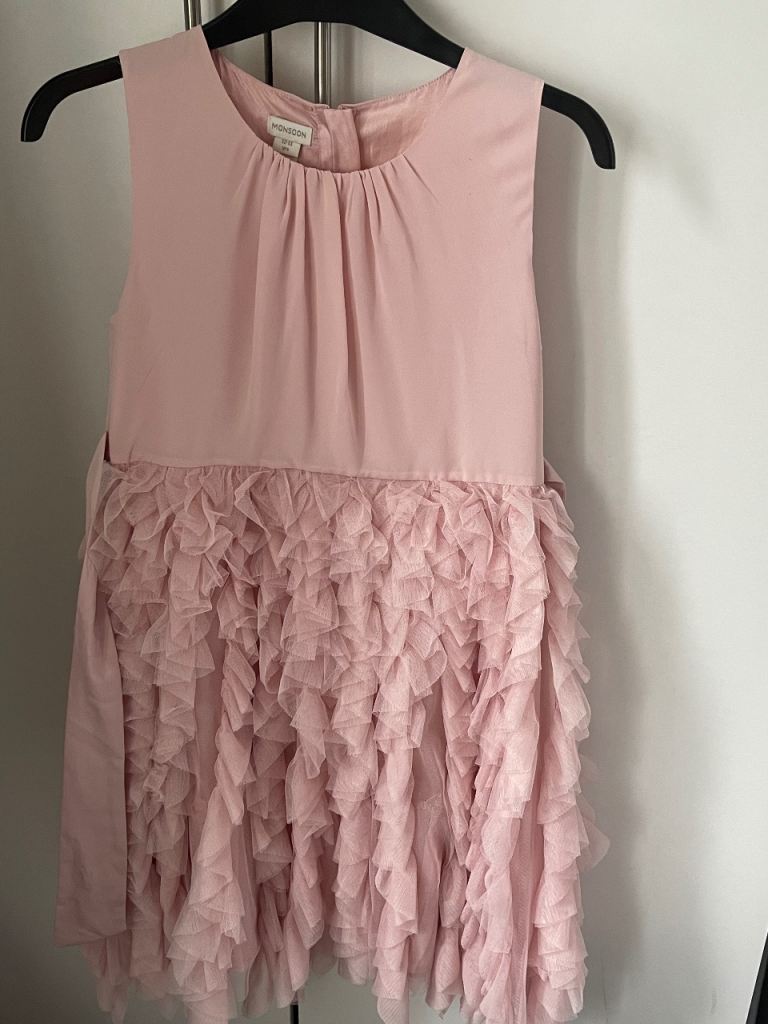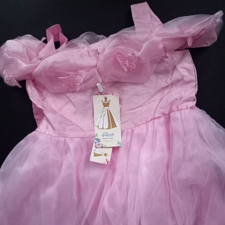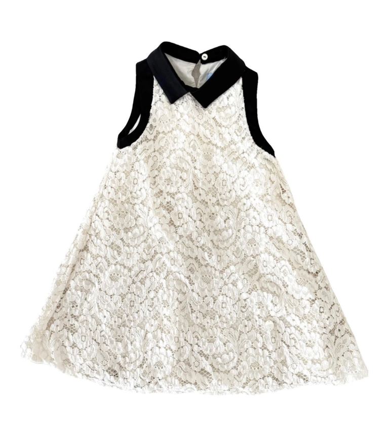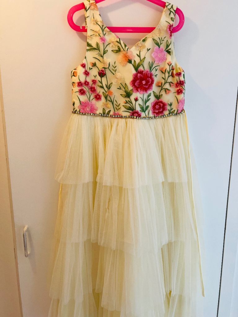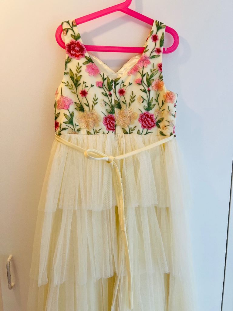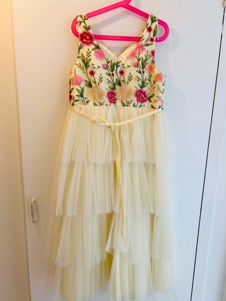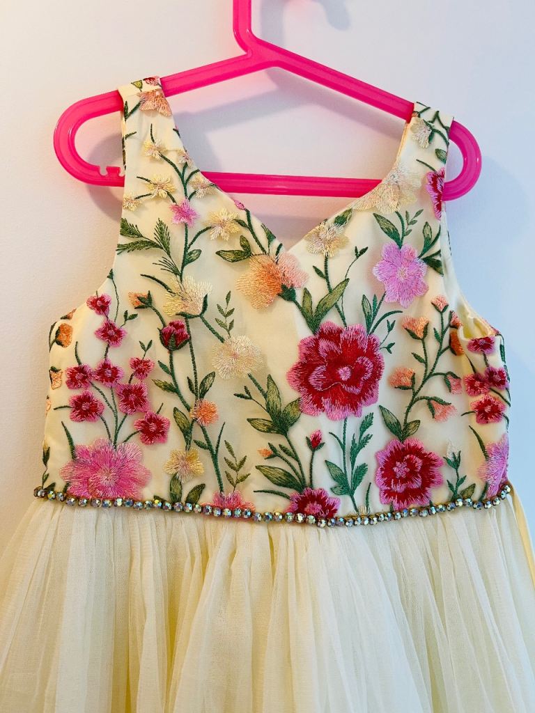Cream dress with a sleeveless design and beautiful floral embroidery on the top. The skirt is made of soft, layered tulle for a flowy, elegant look.