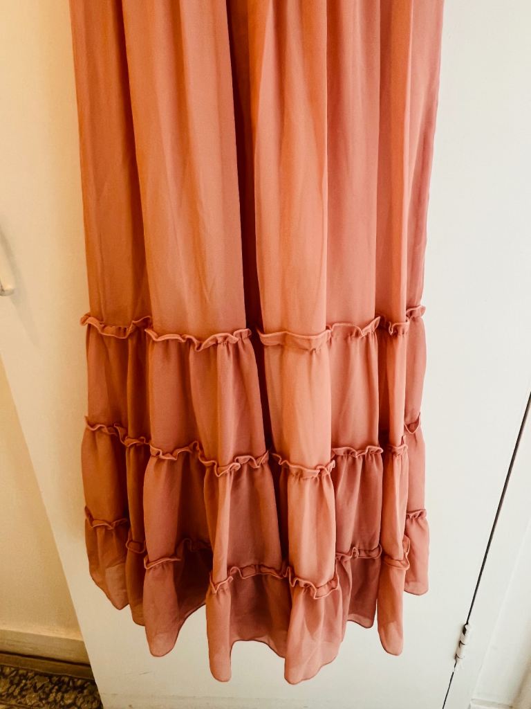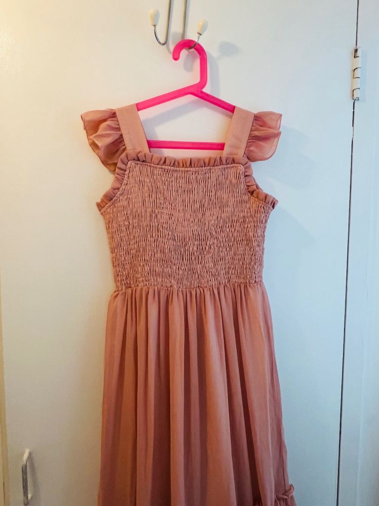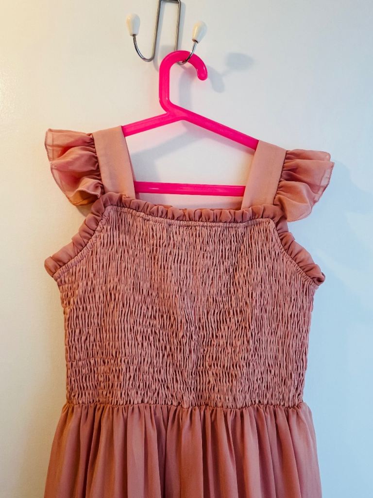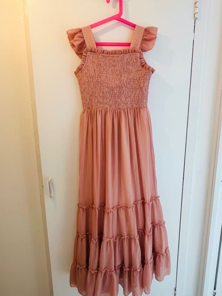 Lovely girls’ dress in a soft blush/rose color, perfect for special occasions or summer outings. It features a stretchy smocked bodice for a comfortable fit, wide shoulder straps with cute ruffle details, and a flowy tiered skirt that adds a nice, airy movement.
