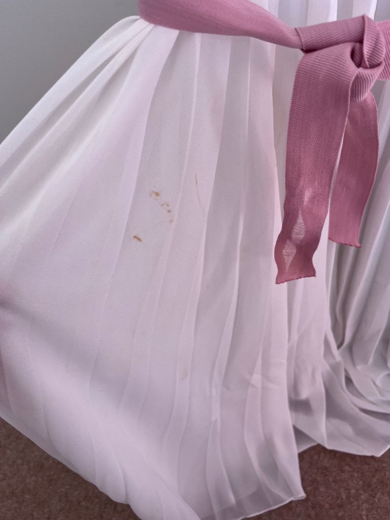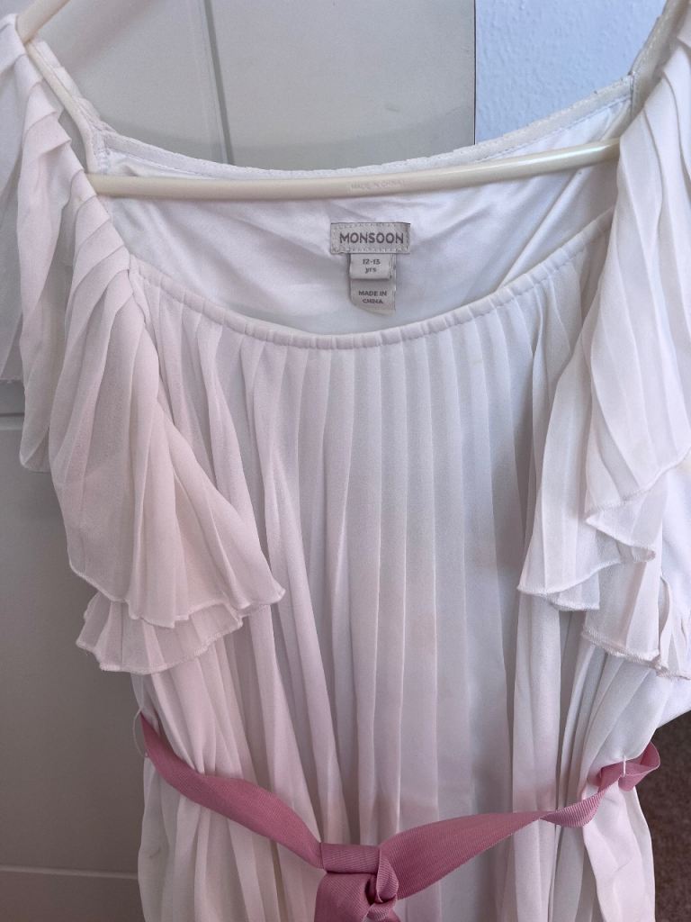 Monsoon dress. White with Blush pink belt, worn once for wedding abroad, has slight marks shown in pics otherwise good condition. Size age 12-13 relaxed fit.