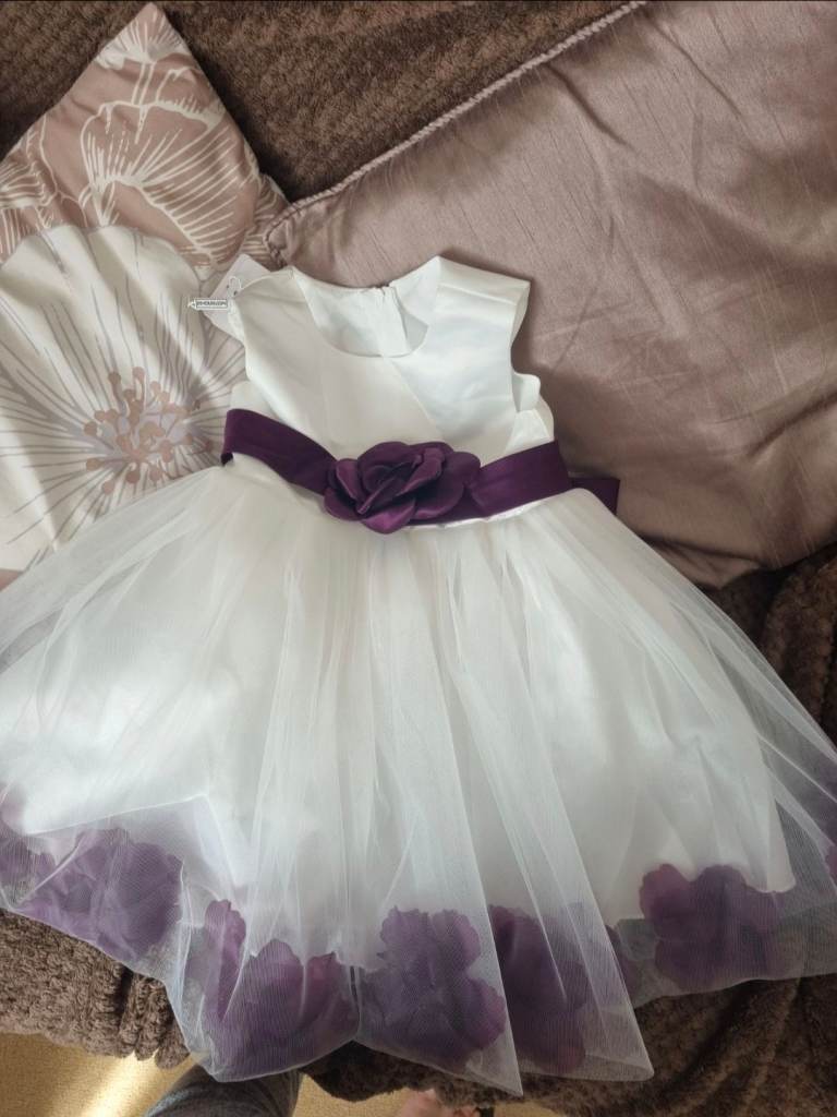 Girls size 4-5 years dress, never been used or worn in great condition. Perfect dress with a grape coloured sash with bow at the back and grape flower petals in the skirt. Also have a size 8-9 years! Buyer collects cash on collection £10