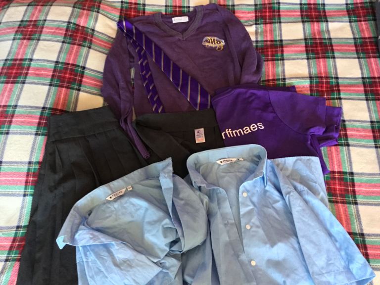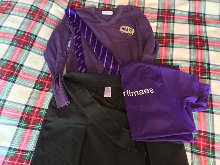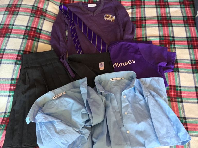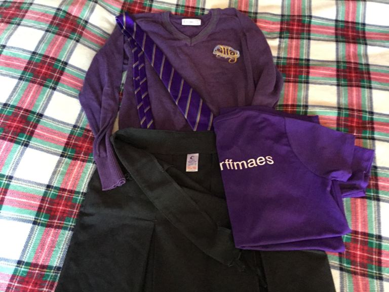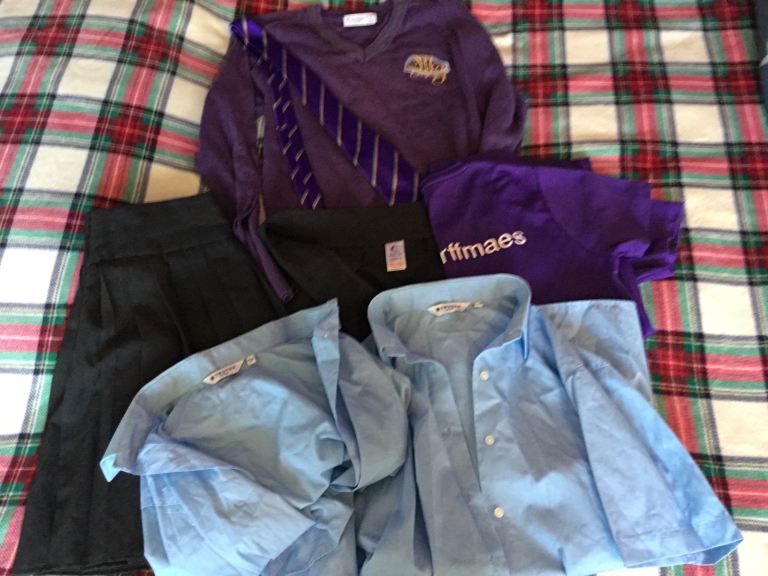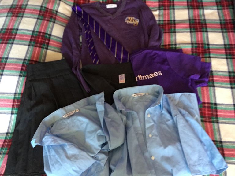 School Uniform Maes y Gwendraeth, Cefneithin, for 12-13 yo girl, rarely used, clean, good condition. Set of 8 pieces containing a branded jumper, 3 skirts (trutex, branded), 2 short sleeve shirts (branded), school tie (branded) plus PE branded shirt.