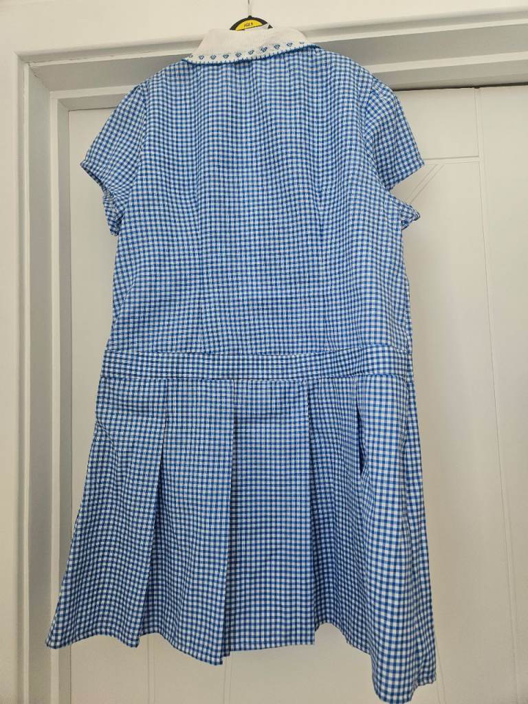 This is a girls' blue gingham school dress, short-sleeved with a white collar.