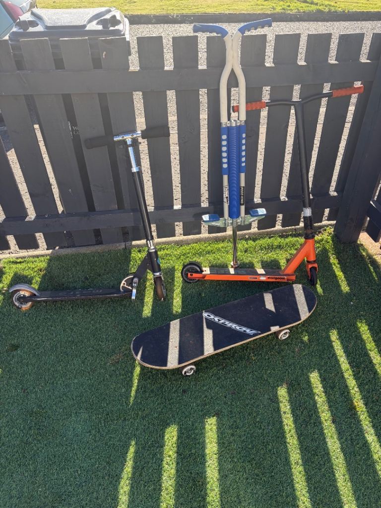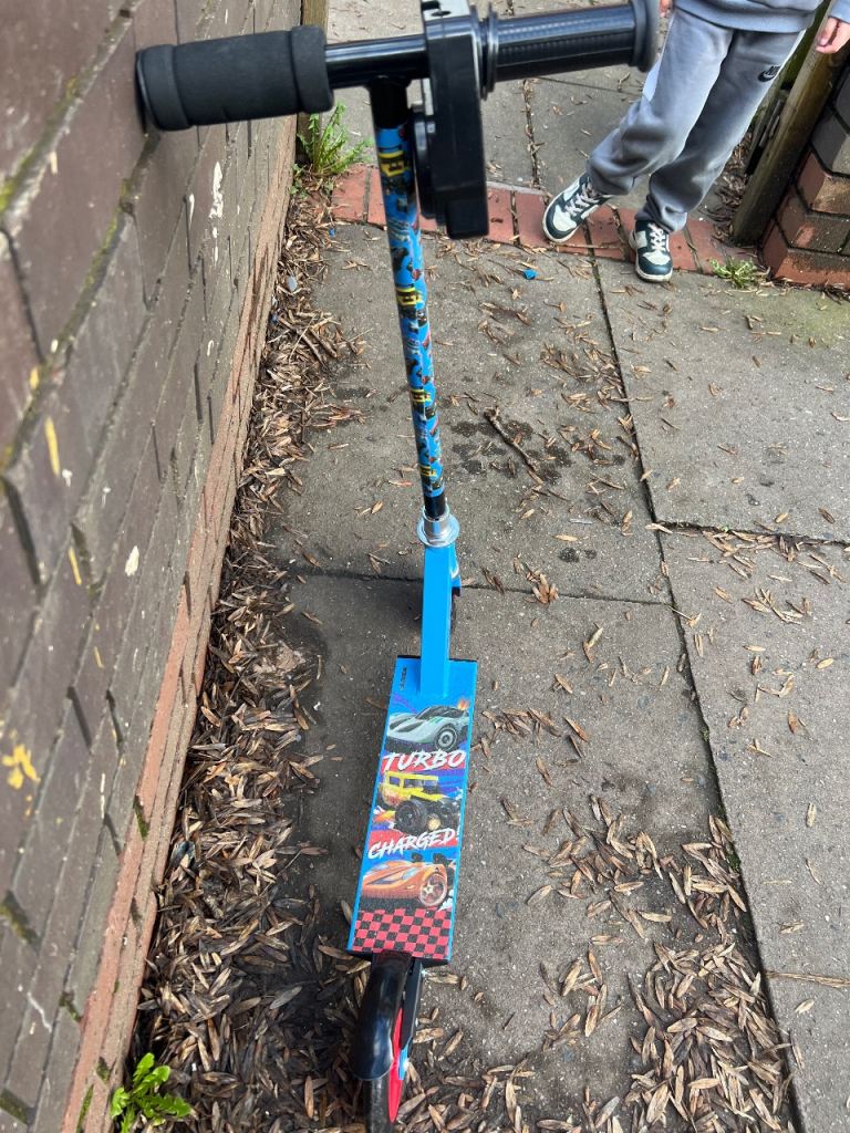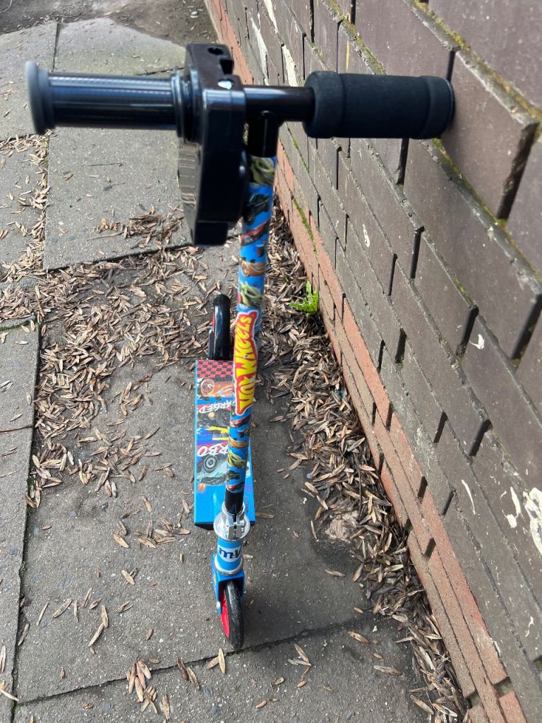A blue kids' scooter with Hot Wheels graphics. Features a colourful design with cars and flames. It's built for fun outdoor play! Use and good collect from b12