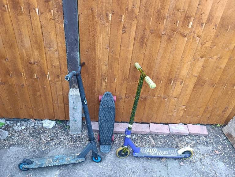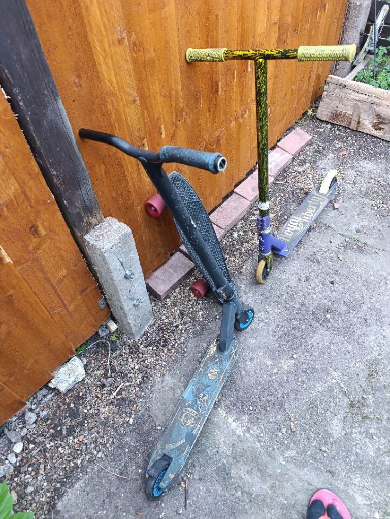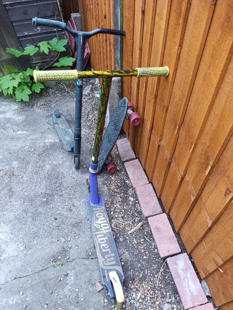 Yellow scooter in good condition and skating board in good condition and one of the handle gripper in black scooter is gone but usable(looking for good offer altogether )