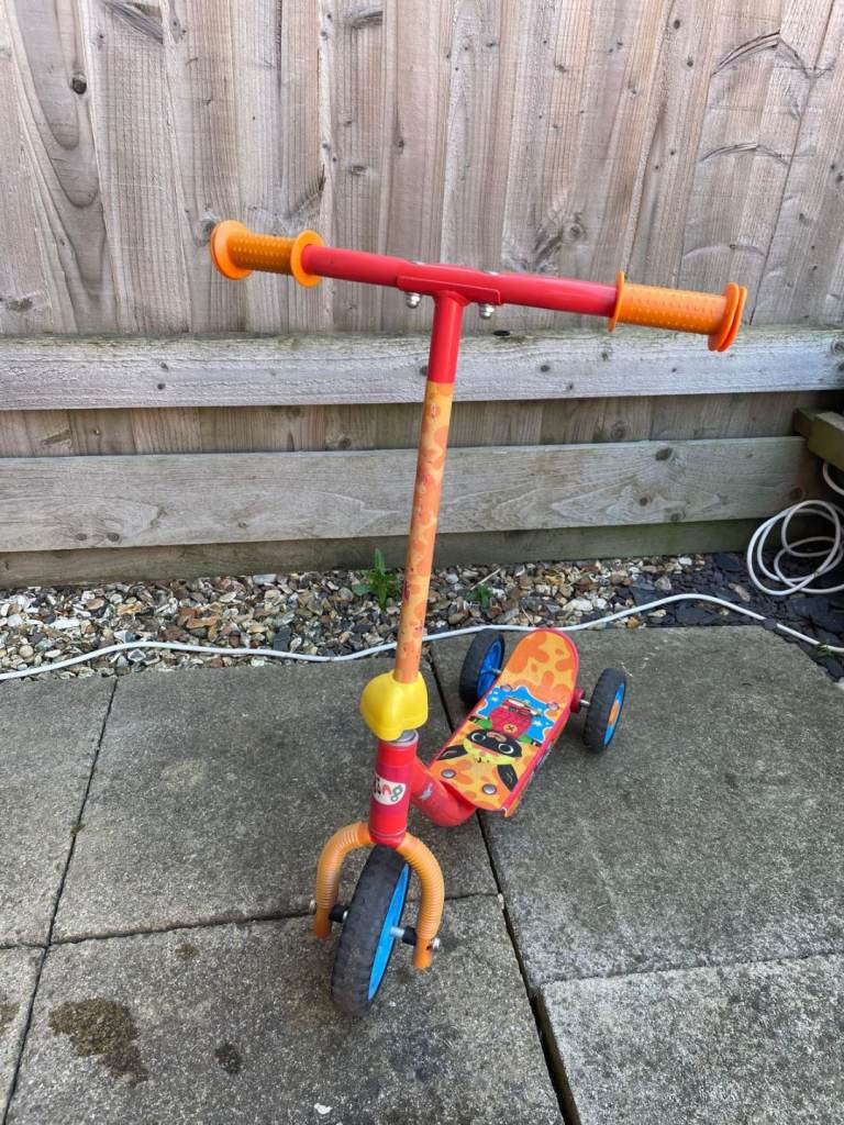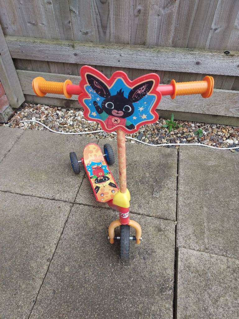 Bing 3 wheeled scooter for sale has been used but has been looked after. May be a few marks and scratches from wore and tore but still in a good condition. From smoke free home and has been keep in the shed.