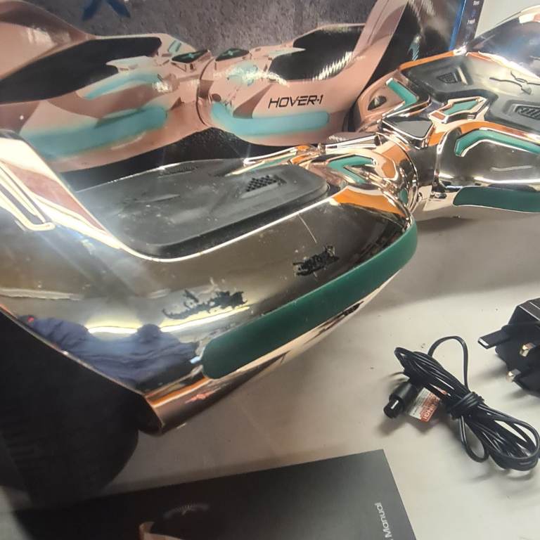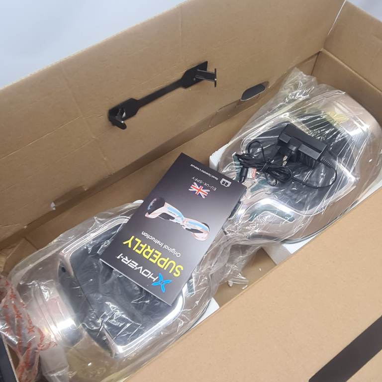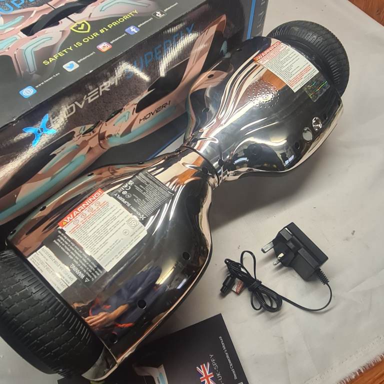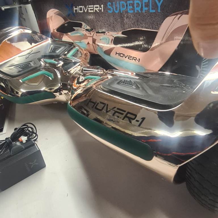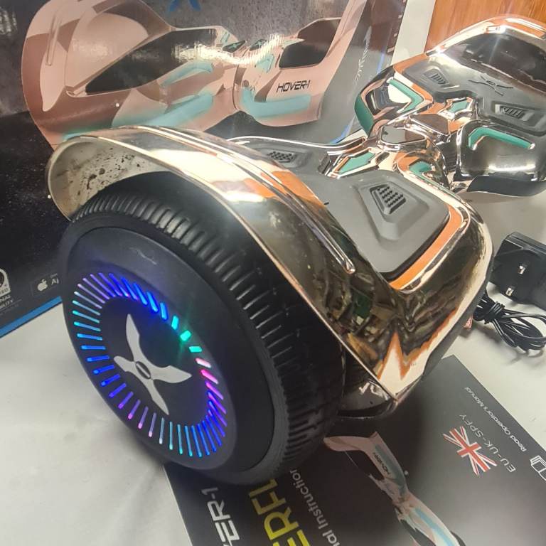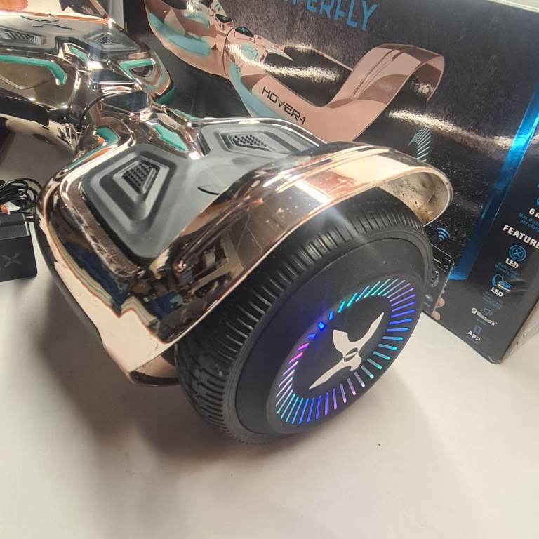 The Hover-1 Superfly Hoverboard in a striking Rose Gold finish complete with a built-in Bluetooth speaker to play in tandem with the customisable LED lights and multi-coloured LED wheel lights. The Mobile App compatible will allow you to toggle your difficulty, check your speed and customise your LED headlights. For added safey, there is IPX4 Water Resistance and UL Certification to the hoverboard and the charger. A rechargeable Lithium-ion battery means you can go to a distance of 6 miles at 7mph and has 6.5 inch wheels for a comfortable ride.