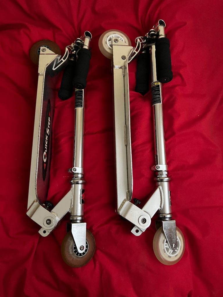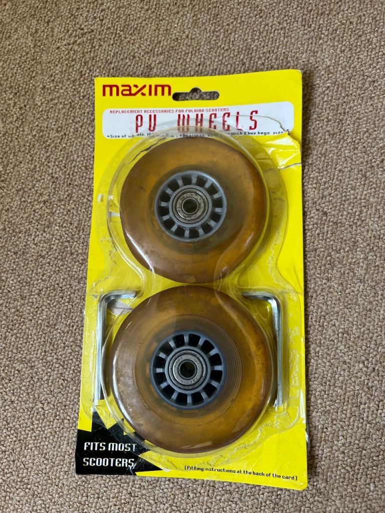 These two scooters are pre loved but in good condition. One has a BRAND NEW set of wheels fitted with the old ones still available as spares.