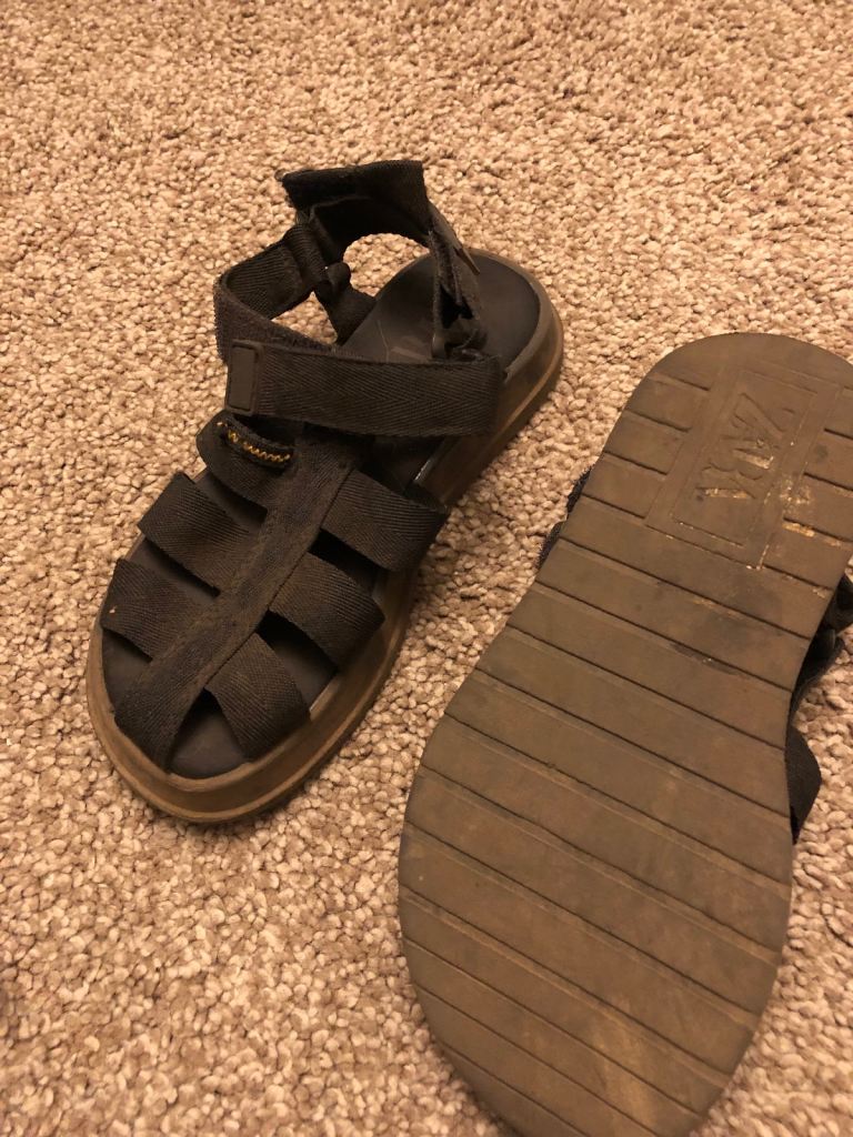 Used Adidas sliders (we think they are size 4 as just been outgrown by individual who has just got size 5s). A little weary on the outside stripes of one shoe (see photos) but indestructible!