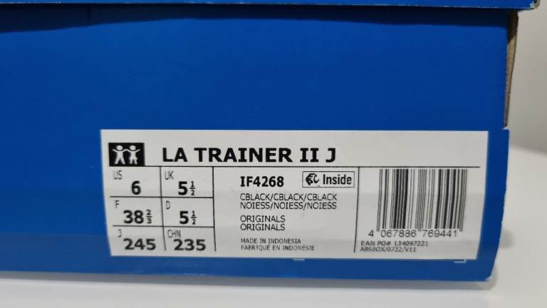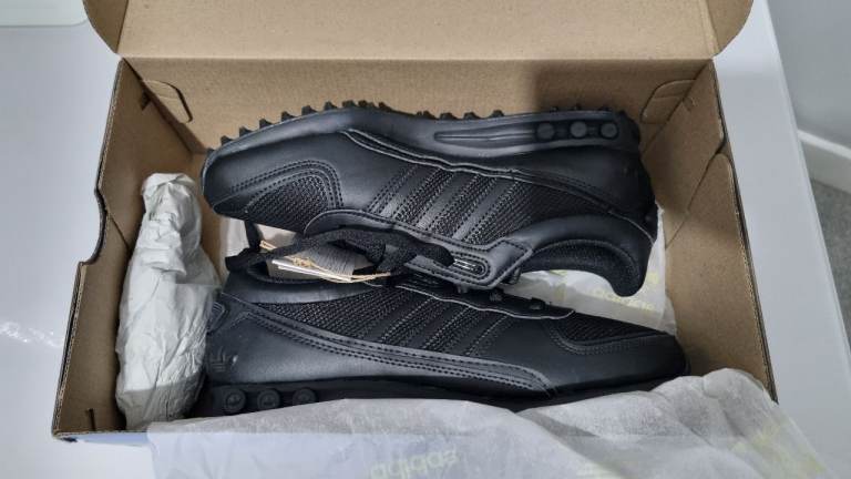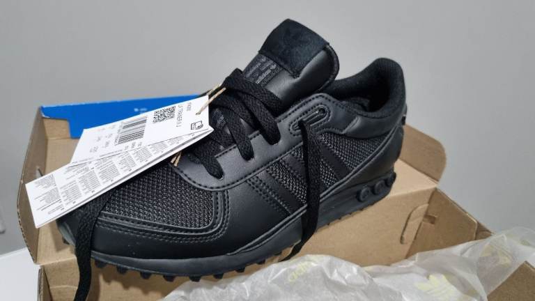Brand new Adidas LA Trainer II J trainers in black, still with tags attached.
