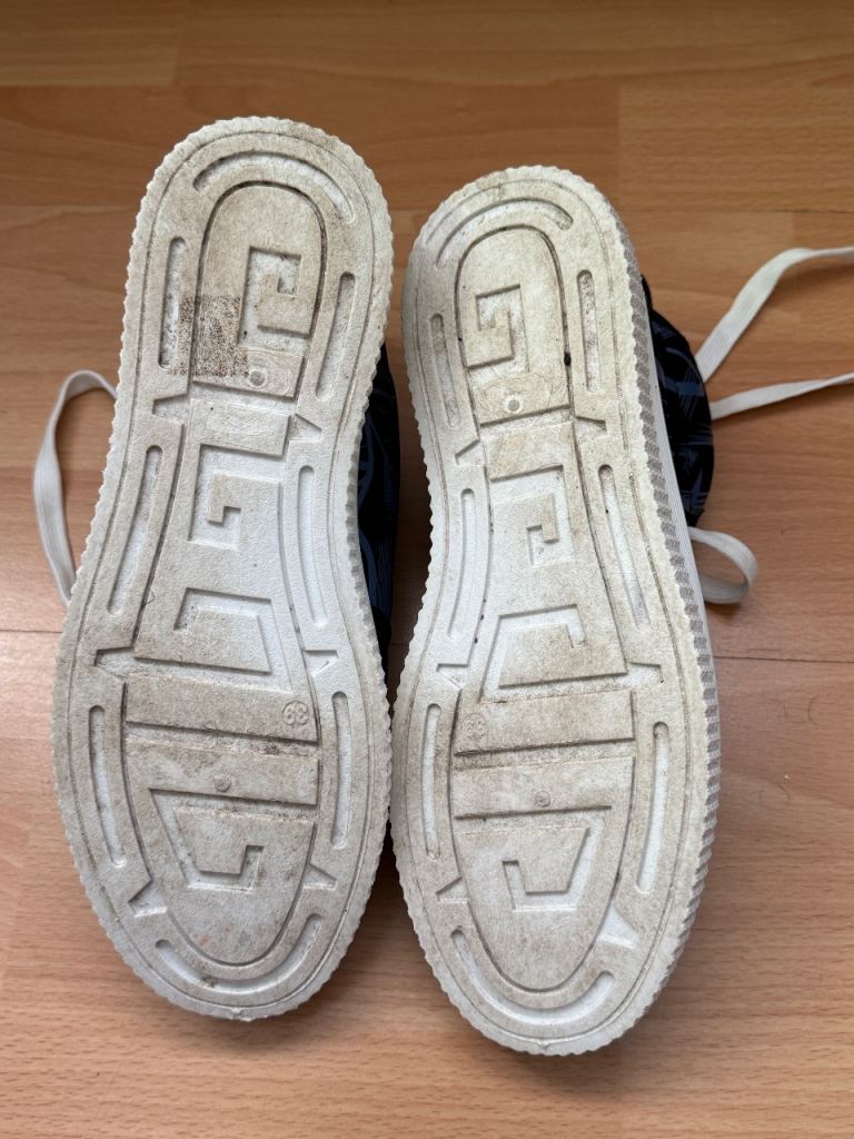 Black with blue pattern, White soles