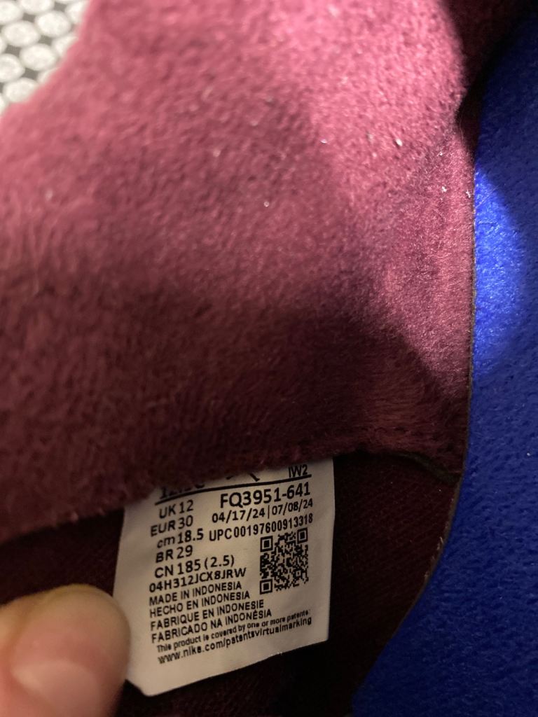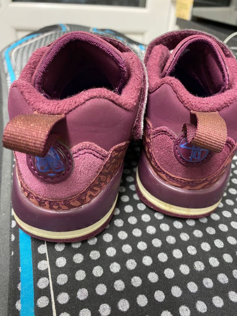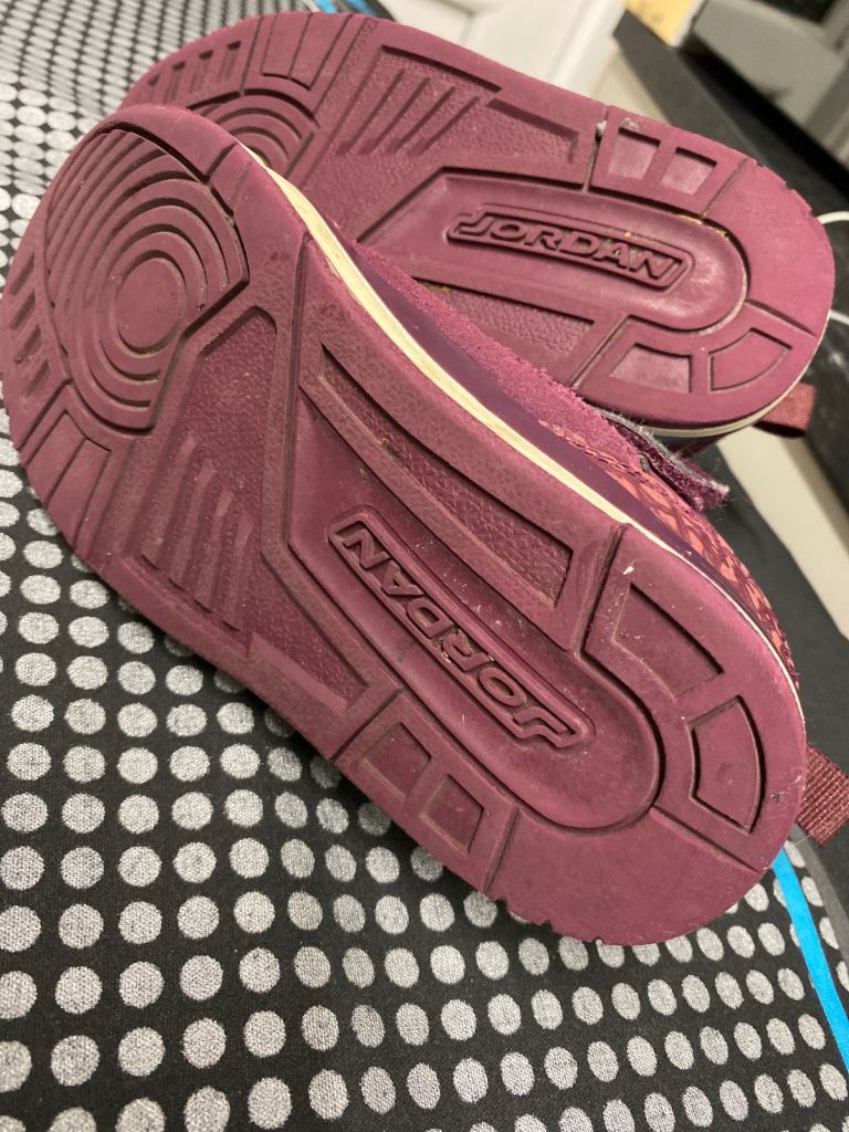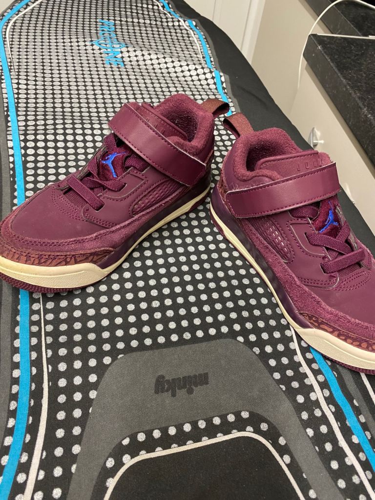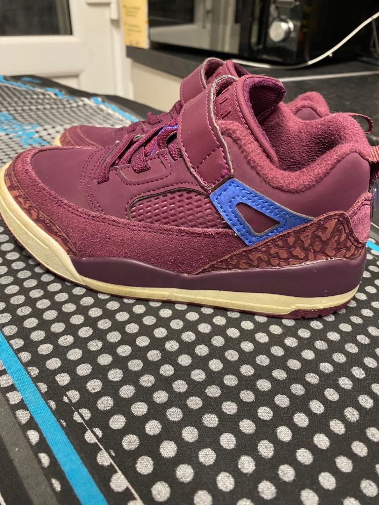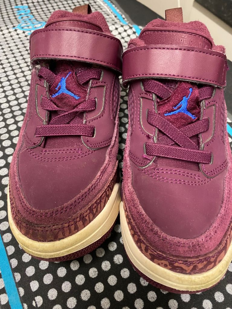 Kids Jordan trainers in size UK 12 (little kids). Burgundy colour with blue Jumpman logo. Still in good wearable condition with plenty of life left. Some expected signs of use, including a bit of wear on the soles (shown in photos), but overall clean and solid.