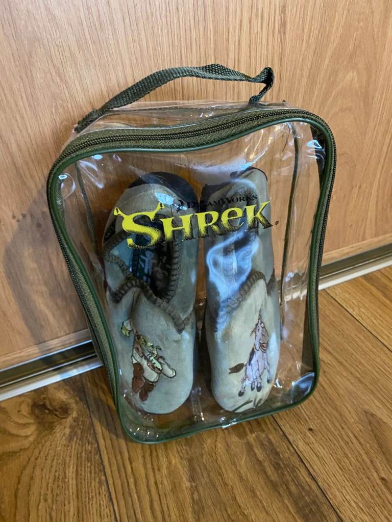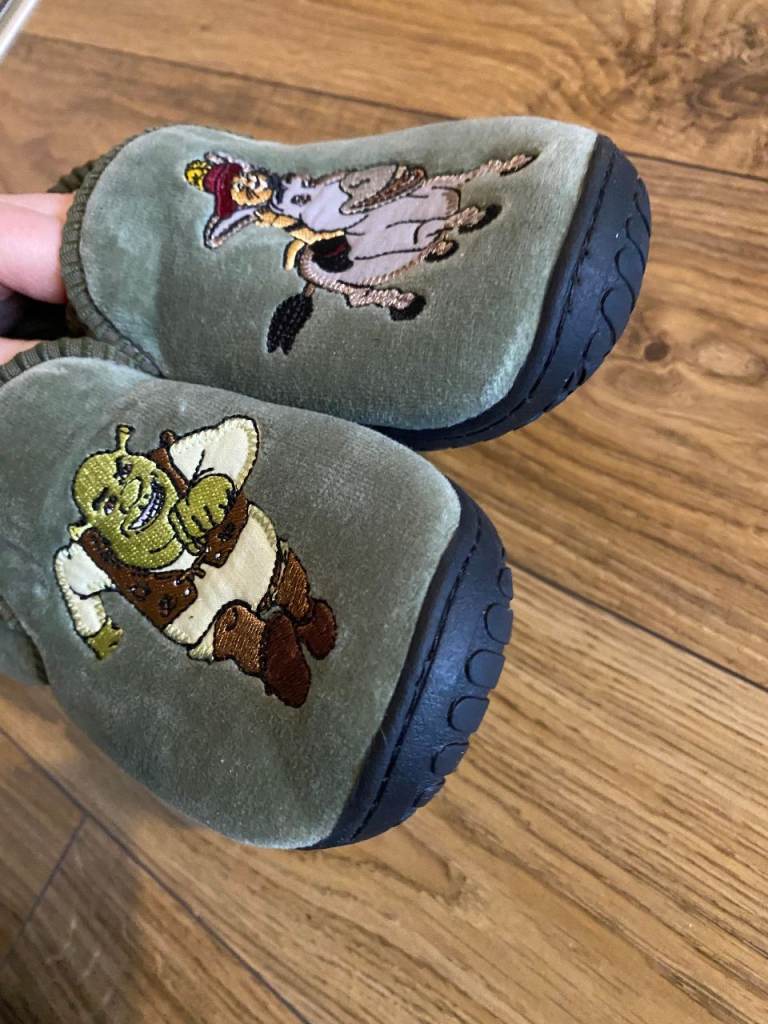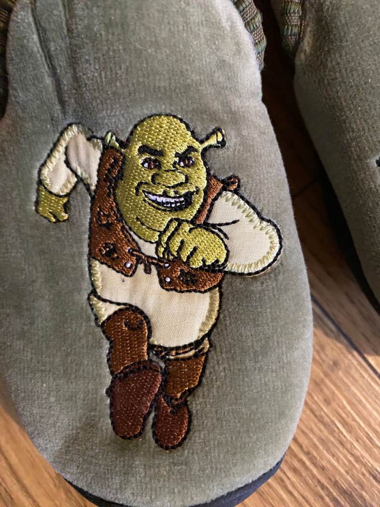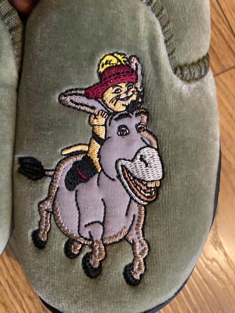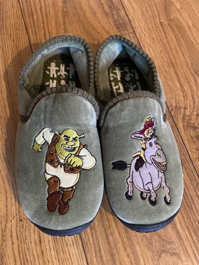 EACH SLIPPER HAS AN APPLIQUÉD & EMBROIDERED DESIGN - ONE IS SHREK, THE OTHER IS THE DONKEY & PUSS IN BOOTS. GINGERBREAD DESIGN TO INSIDE.